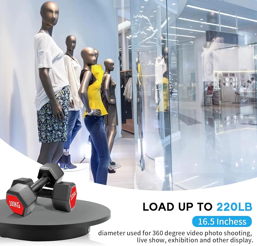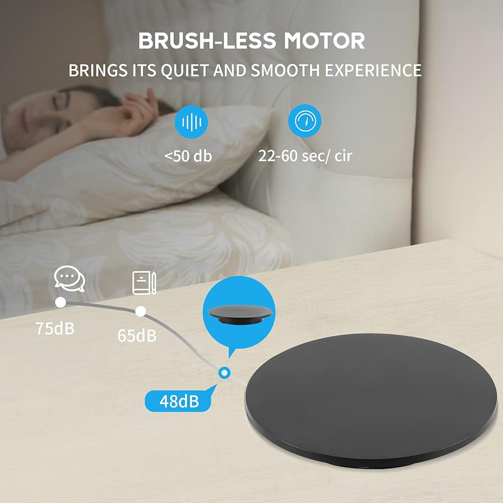 MINUES THE NOISE - The display turntable relates to a smooth motor with low noise <50 dB, won't bother people working or your video shooting. The smooth motor ensures no-stuck and stability during rotation.