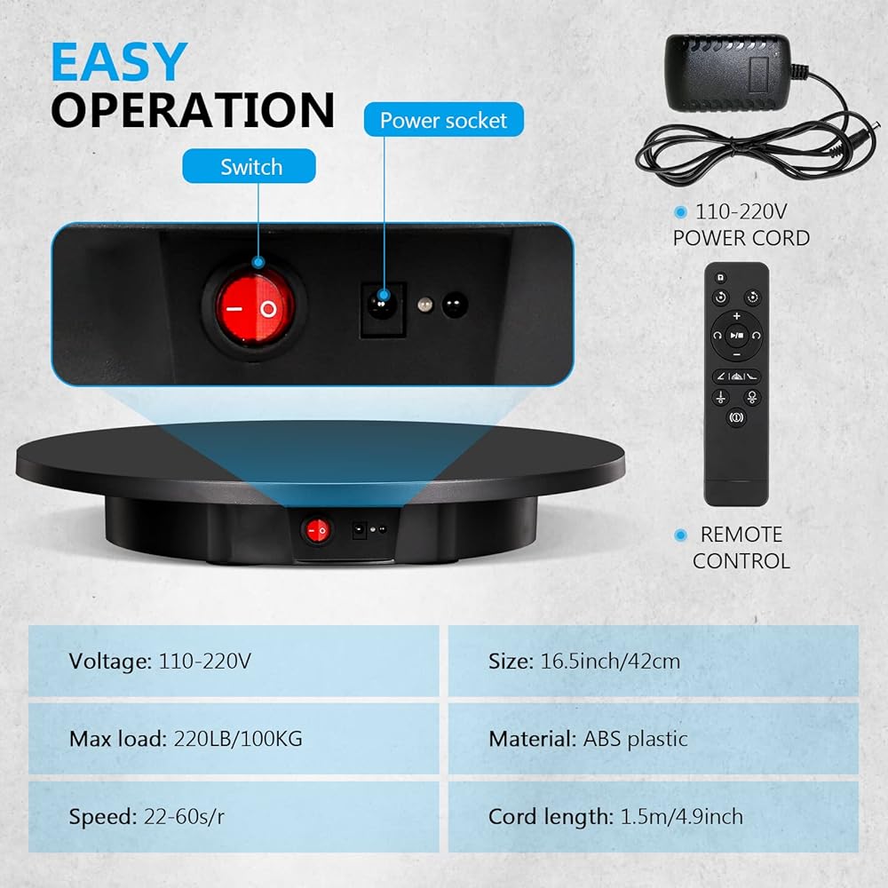 BAOSHISHAN Electric Turntable Stand with Remote Control, 220 LB Max Loading, 16.5" Large Rotating Display Stand for 360 Degree Photography Show of Products, Model, Cake (Black)