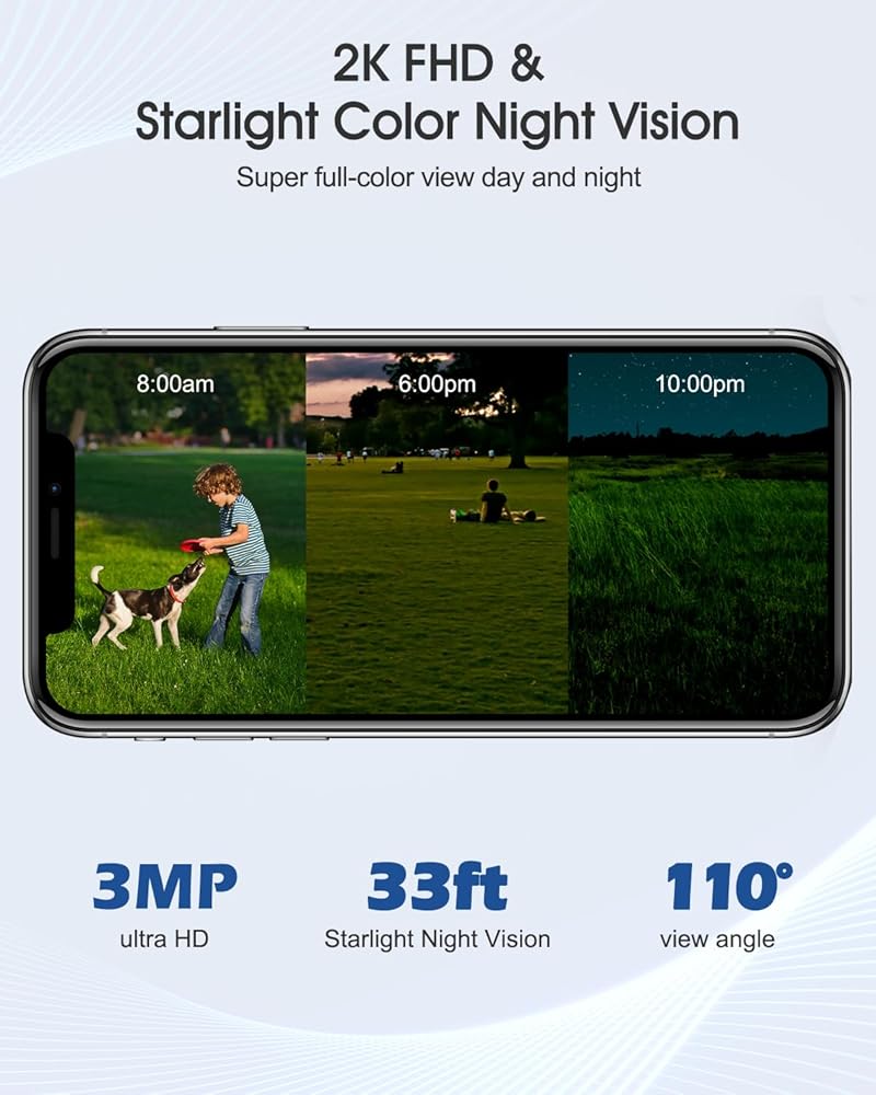 【2K HD Video & Starlight Color Night Vision】 The light bulb security camera outdoor offers super clear 2K 3MP images, making it easy to see everything during the day and night. Updated with the latest tech in 2023, our security cameras wireless outdoor now have color/smart/infrared night vision. Even in complete darkness, you'll get a clear view of all the details within a 33ft range, giving you a fantastic night vision experience.