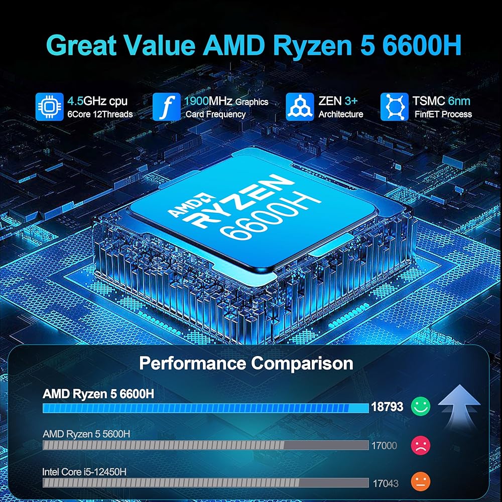 【Superb CPU Performance】Mini PC powered with AMD Ryzen 5 5560U 6 Core/12 Thread(2.3GHz up to 4.0GHz, L2 3MB L3 8MB Cache). Which can turn your desk into a powerful workstation just by adding a keyboard and mouse. WiFi 6(802.11ax) and Bluetooth 5.2 is faster and more stable data transmission and there is no network congestion. More wireless support, say goodbye to cluttered desktop.