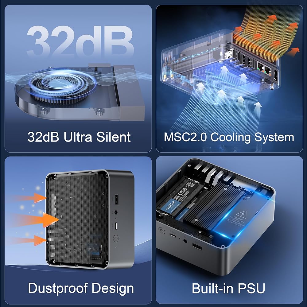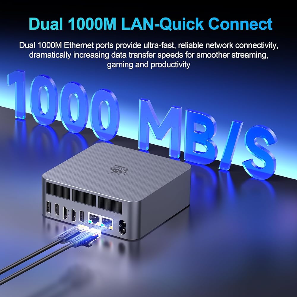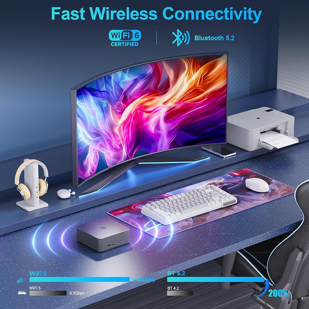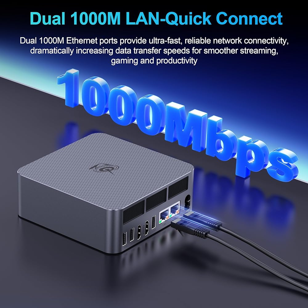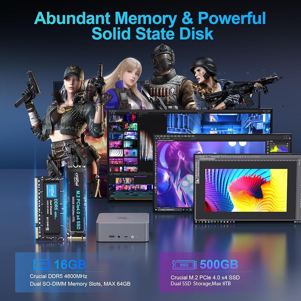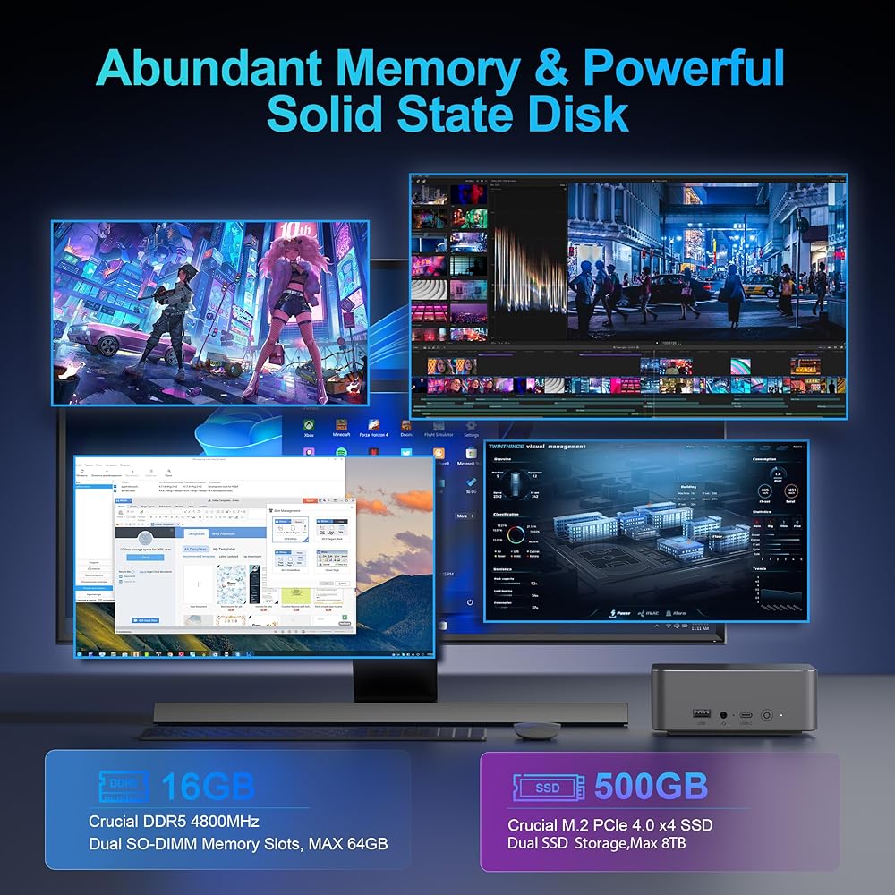 【Large Capacity + Upgrade-Friendly 】Mini computer loaded with 16GB SO-DIMM DDR4 RAM(2666MHz). Dual channel DDR4 upgradeable to max 64GB(2 x 32GB, up to 3200MHz). And 1TB M.2 SSD NVMe 2280 (upgradeable to max 2TB), reading speed up to 3000mb/s. Supporting up to 2TB external 2.5-inch 7mm HDD expansion (extended tutorial in the box). Reduce latency, powerful loading and processing capabilities for a smoother experience.