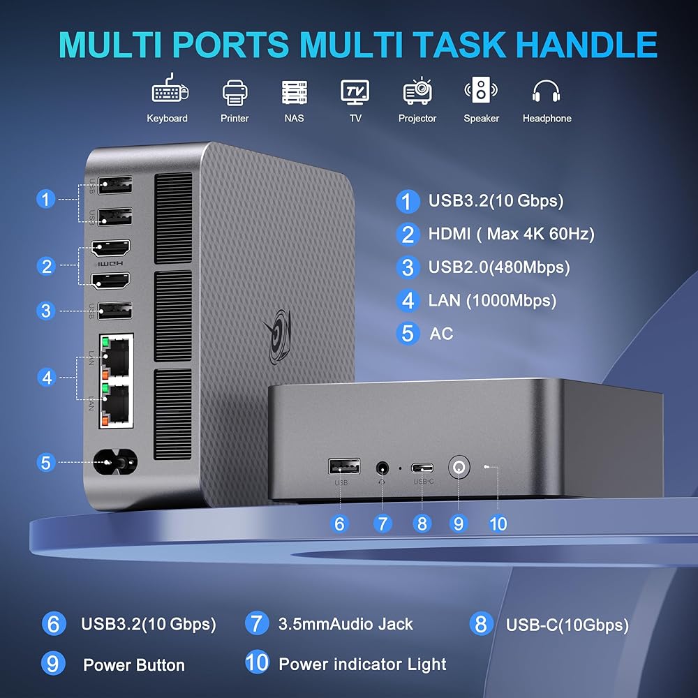 【Multi Interface Design & Meet Deeply Needs】Beelink mini pc small computer is equipped with 1*HDMI2.0 ports, 1*DP1.4 ports, 3*USB3.2 Gen2 ports, 1*USB2.0 port, 1*Type-C(Data&Video) port, 1*DC Jack, 1*RJ45 1000m port, 1*3.5mm Audio Jack(HP&MIC) port. Supports Gigabit Ethernet RJ45 1000M network connectivity. The small pc also can be used for gaming and virtualization work. Gaming recommendations: LOL, DOTA 2, PUBG, OW, CSGO, Apex Legends, Far Cry 3, Assassin's Creed 4, Skyrim, etc.