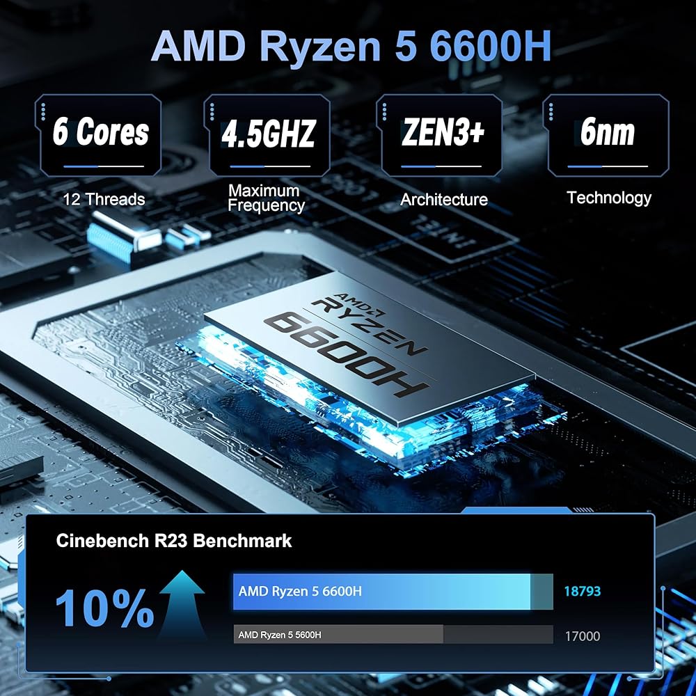 Beelink EQR6 Mini PC, AMD Ryzen 6600H (6C/12T, Up to 4.5GHz), 16GB DDR5-4800MHz 500GB PCle 4.0 SSD, Support Dual 1000M LAN, Ultra-Quiet and Built-in Power Supply, Home/Office Micro Desktop Computer