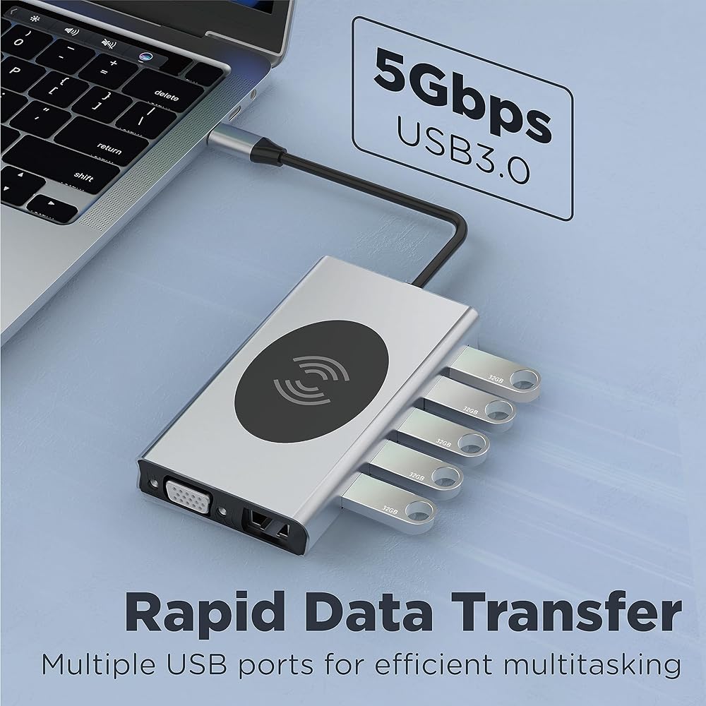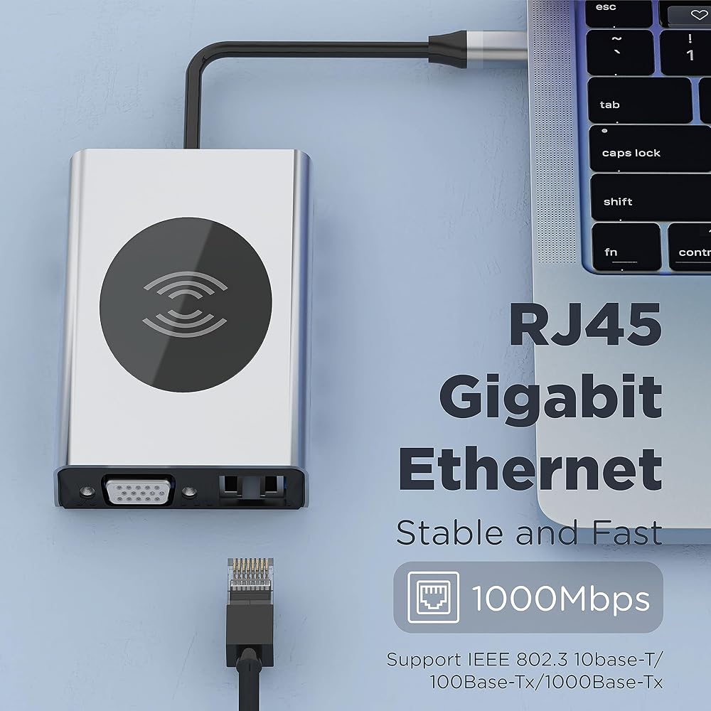 Upgrade your laptop experience with PowerBear's USB-C Adapter! Our adapter is designed to stream and extend video to your monitor, projector or TV with HDMI, while providing multiple super-fast USB 3.0 and 2.0 ports to connect all of your external devices. Say goodbye to lagging keyboard and mouse, and hello to seamless connectivity. Our adapter supports a wide range of devices, including MacBook / MacBook Pro, XPS 13 inch / 15 inch, Yoga5 Pro / 6 Pro / 900, and more! Enjoy crystal-clear picture quality with our HDMI port that supports resolutions up to 4K@30Hz. With 100W pass-through technology, you can charge your USB-C laptop and keep it powered up all day. Plus, our Type C Charger PD3.0 Fast Charging Port provides high-speed charging for your iPhone 14 13 12 12pro 12pro max 12mini 11 11pro and more, delivering a charge of up to 10W with ease. Experience faster and more stable Ethernet connections than most wireless connections, with speeds up to 1Gbps, while also being backward compatible with 100Mbps/10Mbps. Our adapter is perfect for online gaming and work efficiency. And with our convenient SD & TF ports, you can read and write to two cards simultaneously, compatible with all kinds of TF/SD cards and USB 3.0 devices, such as flash drives, cameras, printers, hard drives, and more. No app or driver needed, our adapter is plug-and-play! Upgrade your laptop connectivity today with PowerBear's USB-C Adapter. Enjoy ultimate convenience and seamless connectivity with our multi-functional adapter. Order now and unlock the full potential of your USB-C laptop!