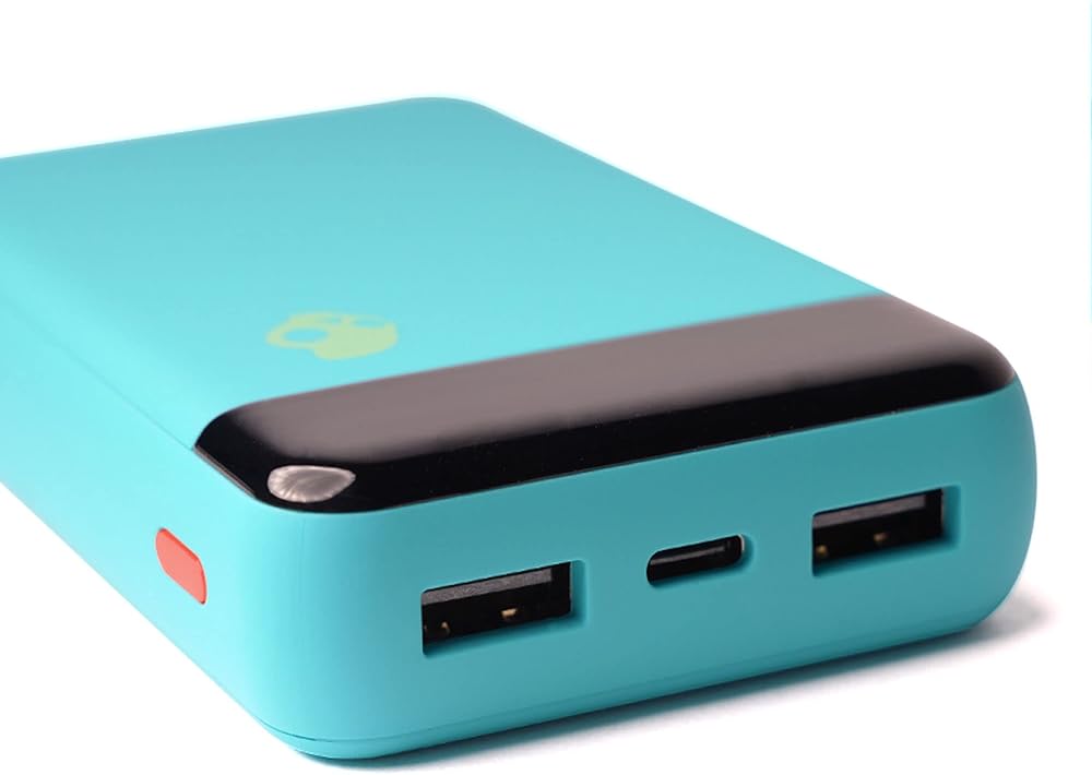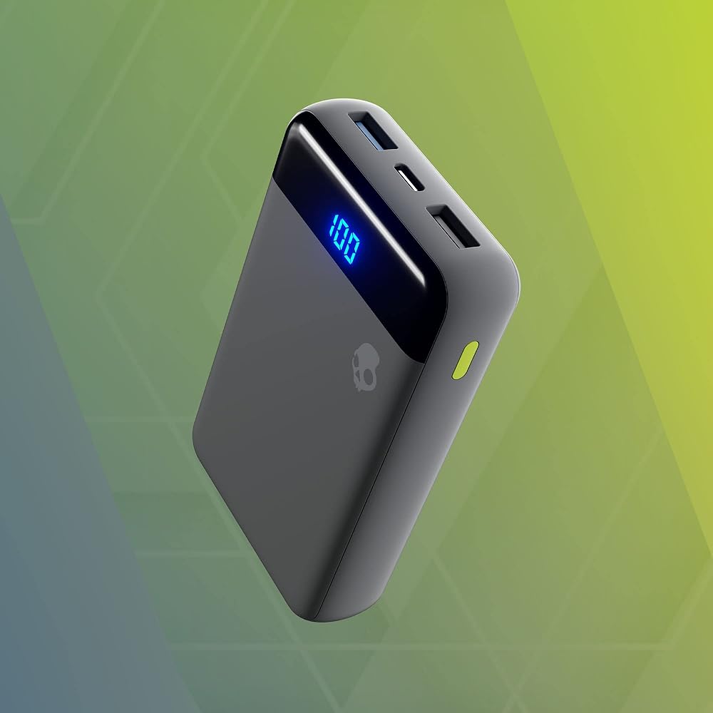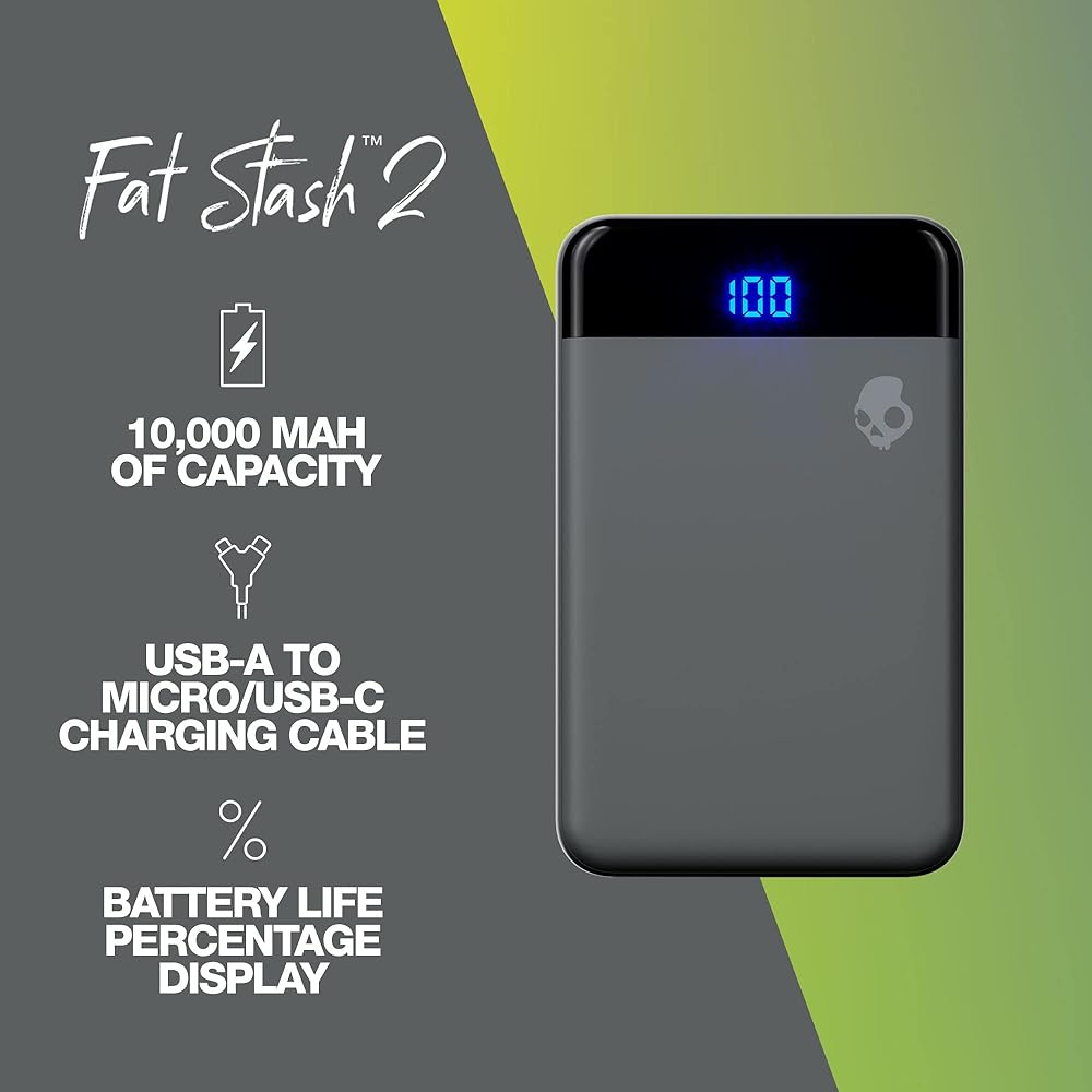 Skullcandy Fat Stash 2 Portable Charger, 10000mAh Power Bank with 20W USB C Fast Charging Port and 2x 18W USB A Charging Ports, Bonus USB A to Micro USB / Type C Dual Charging Cable - Grey/Yellow