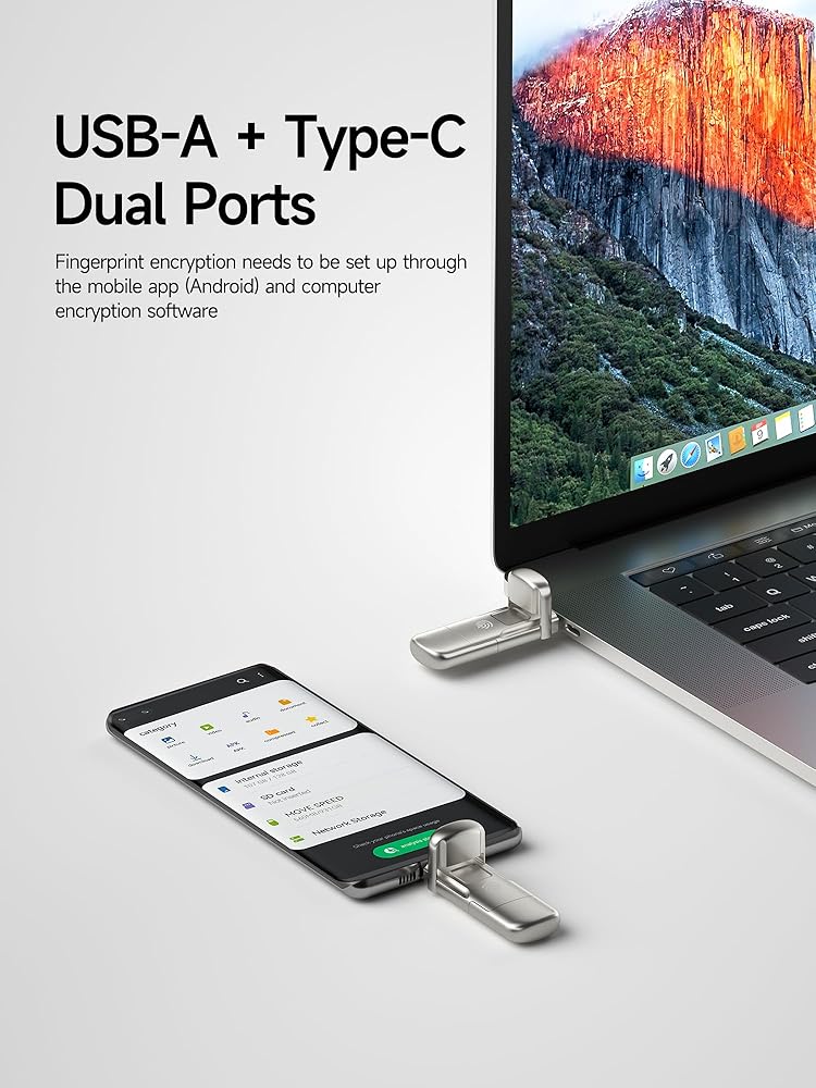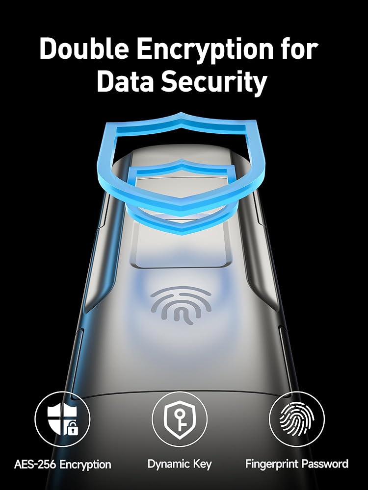 【Double encryption for data security】: Fingerprint & Software Encryption bring double security for your valuable date. AES-256 encryption technology and fingerprint biological dual encryption method fully protect your data without fear of loss.