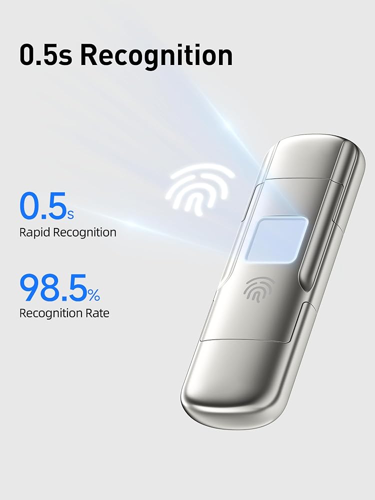 【0.5S rapid recognition and 98.5% high recognition rate】: This flash drive features 0.5s precise recognition and 98.5% recognition rate. Newest fingerprint recognition technology effectively prevent false fingerprints. This USB drive can add 10 fingerprint IDs at most, which can ensure that files are used internally within the team.