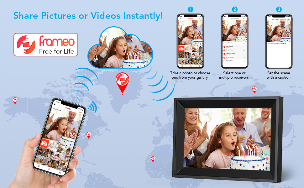 Share your memories instantly with our WiFi digital photo frame. Our Frameo app allows for easy, wireless sharing of photos and videos (up to 15s) from anywhere in the world. With cloud storage located on secure, encrypted servers, your photostream is always safe and private. The app is available for both Android and iOS, making it easy for everyone to share their favorite moments.