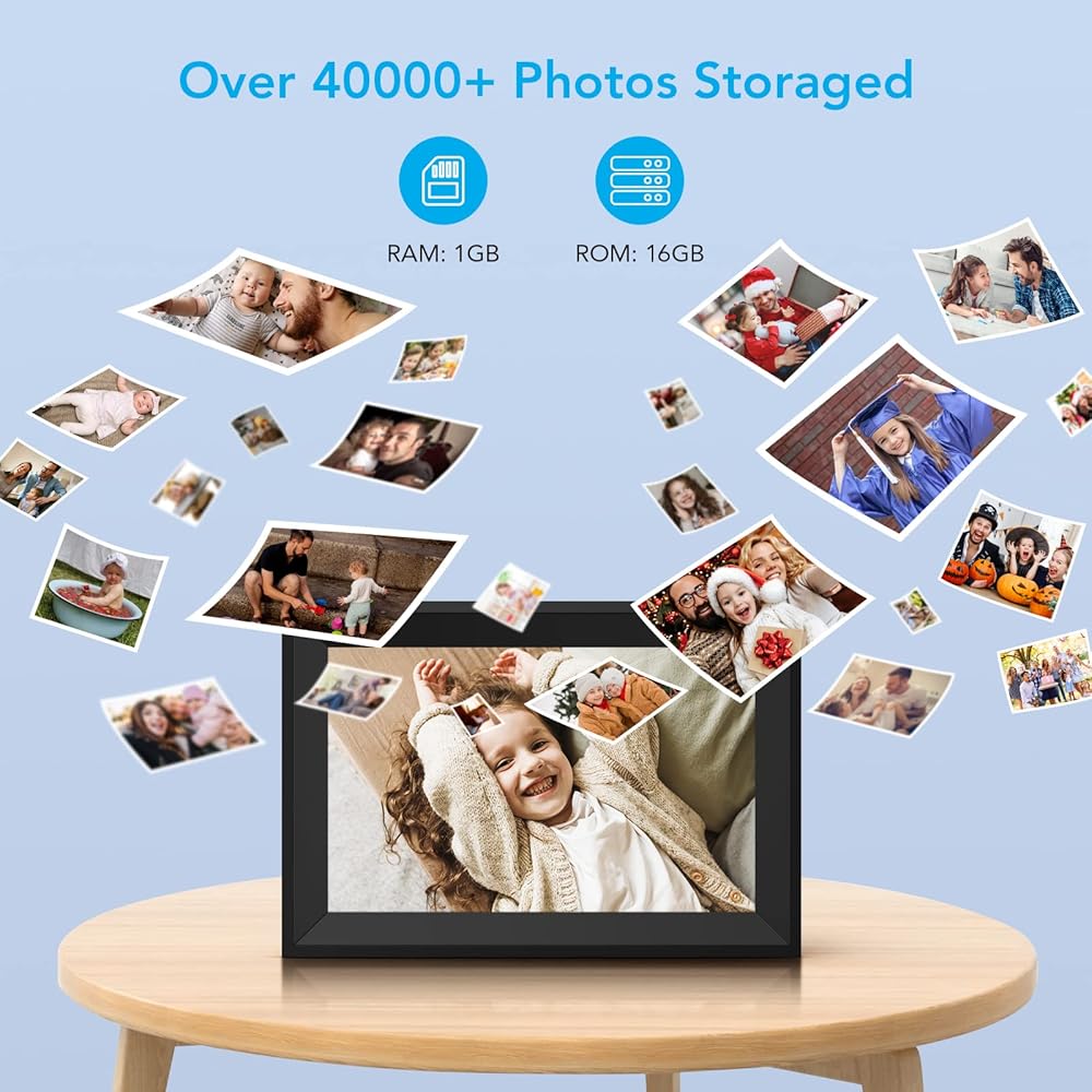 Never run out of storage space with our photo frame's built-in 16GB memory, capable of storing up to 40,000+ photos. With 1GB of RAM and a quad-core CPU, you'll experience a smooth and seamless touch screen experience. Our electronic picture frame also supports a max 64GB SD card for easy file management.