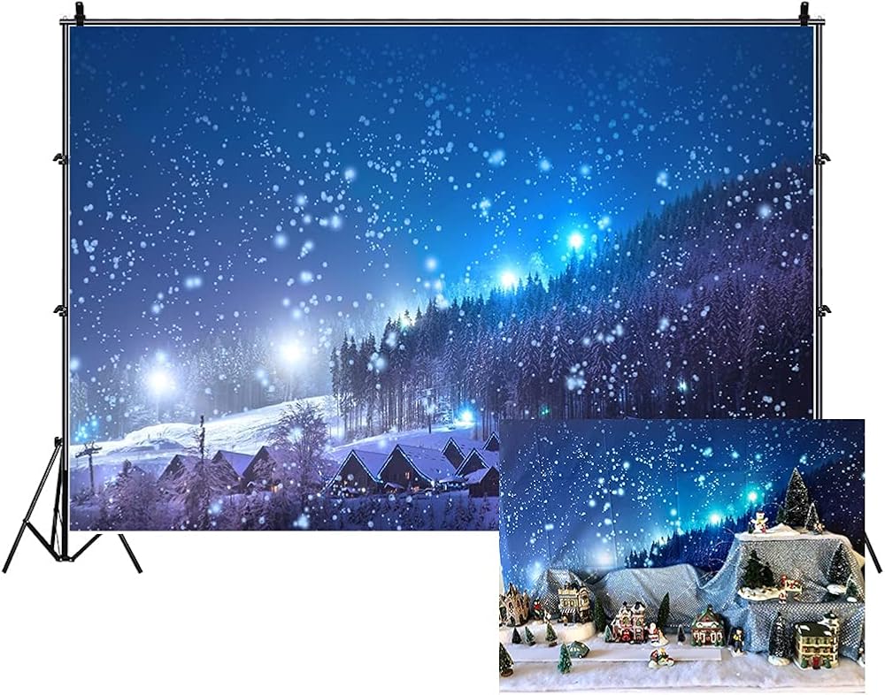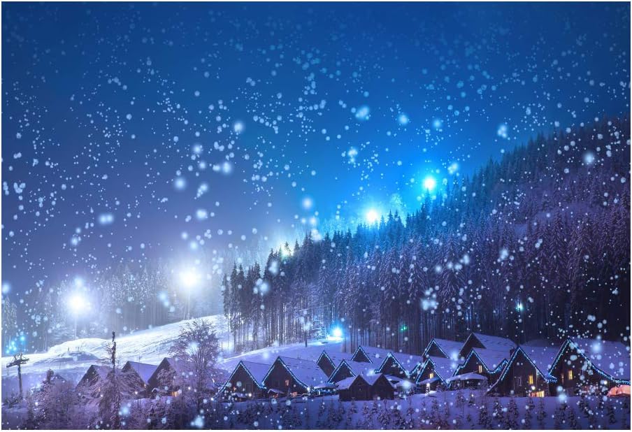 Leowefowa 5x3ft Christmas Backdrop Rustic Village Night View Forest Trees Snowing Shining Lights Blue Sky Winter Xmas Vinyl Photography Background Kids Children Adults Photo Studio Props