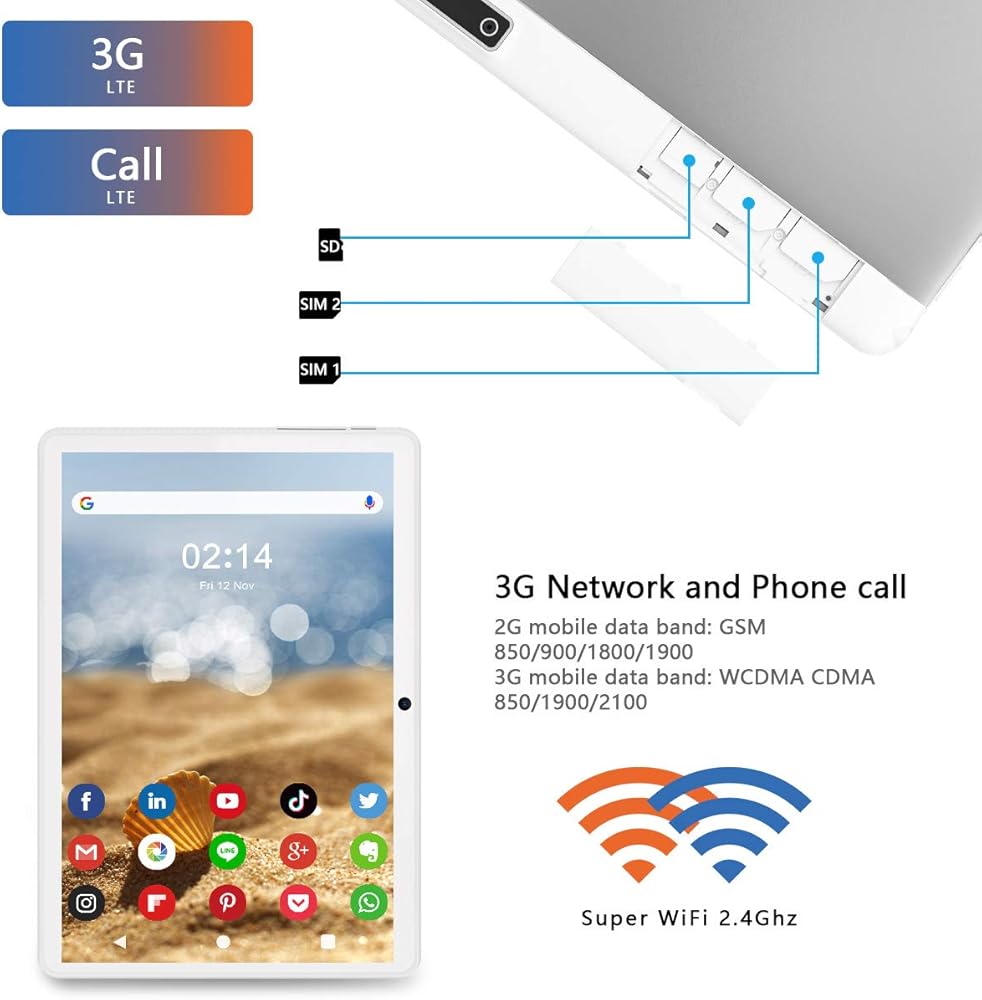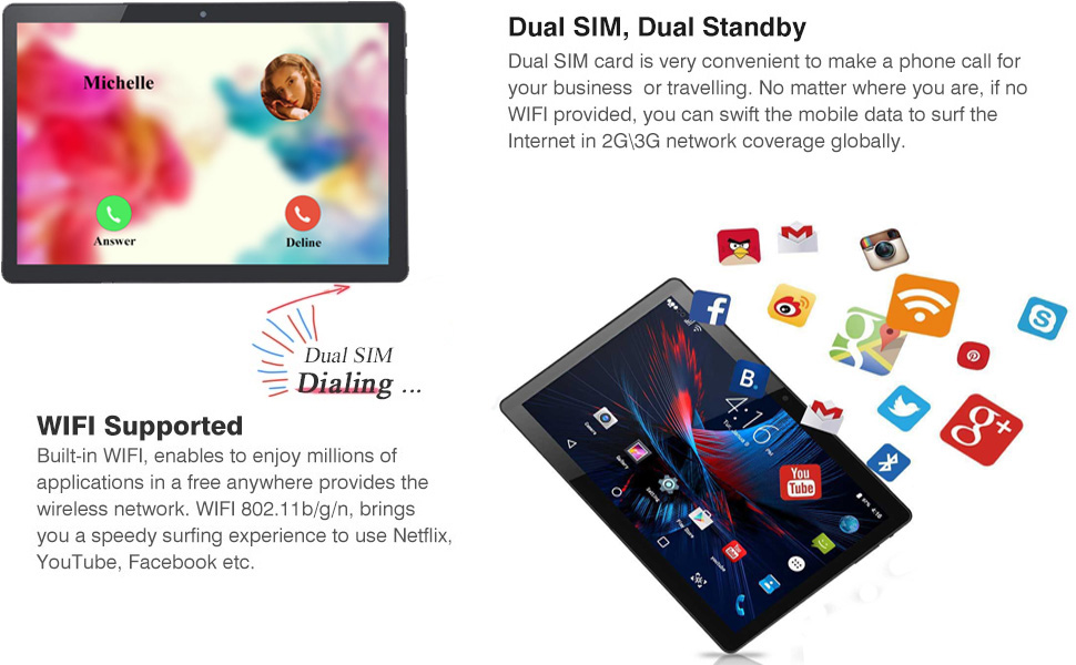 【مكالمة هاتفية من الجيل الثالث وتوصيل WIFI】---يدعم أحدث جهاز لوحي إدخال قطعتين من بطاقة الهاتف، مما يتيح لك الاتصال أو إرسال جلسات تدليك إلى أي شخص في أي مكان وفي أي وقت حتى بدون واي فاي. اتصال واي فاي 2.4G مثالي للاتصال السريع بالشبكة.