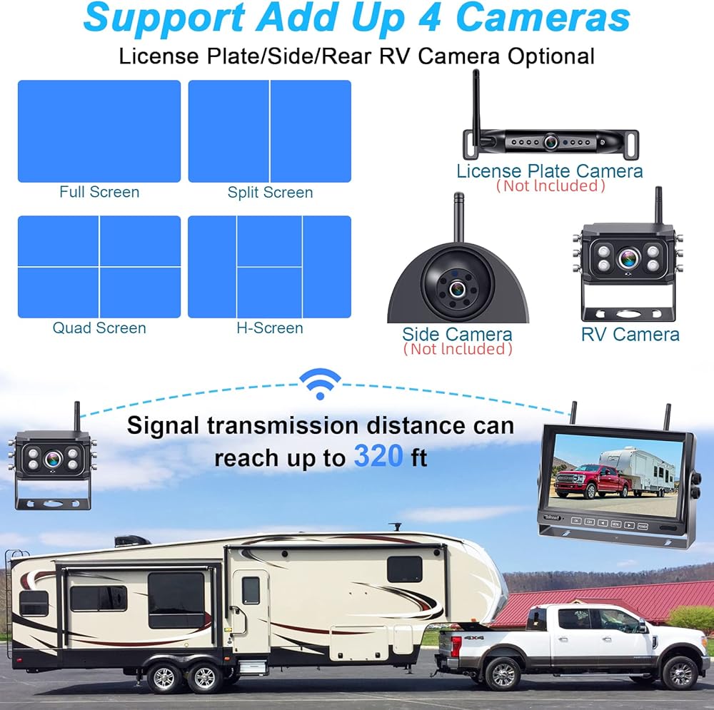 ★ Touch Key & 4 Channels - The touch button rv backup camera wireless is easier to use and more responsive for modern smart living. The backup camera with monitor can also watch four channels at once, with the option to add three additional reverse cameras to avoid visual blind spots.
