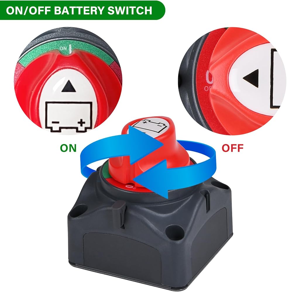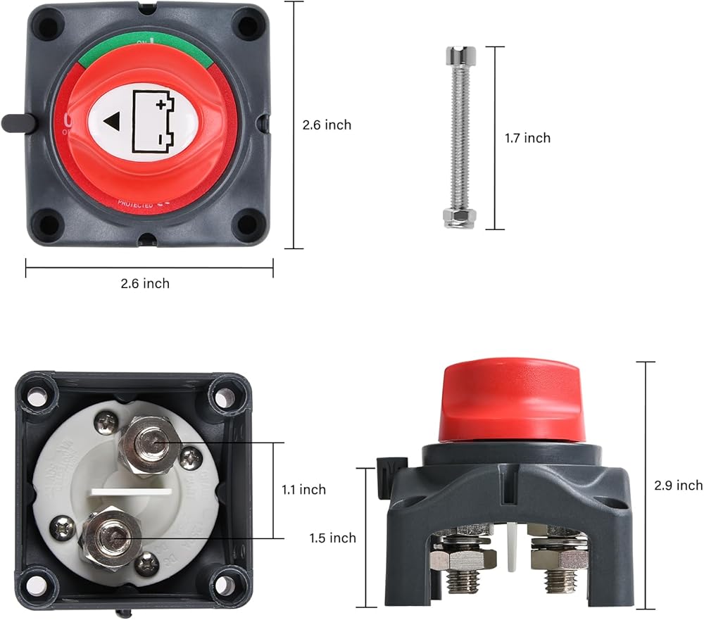 Copper Terminal Stud Size: 3/8" (10 mm) x 2, easy to install, universal used for car, vehicle, Rv and boat, and electrical equipment's switch. On/Off 2 positions, 275 A continuous at DC 12V, 350 A intermittent at DC 12V, 1250 A momentary at DC 12V.