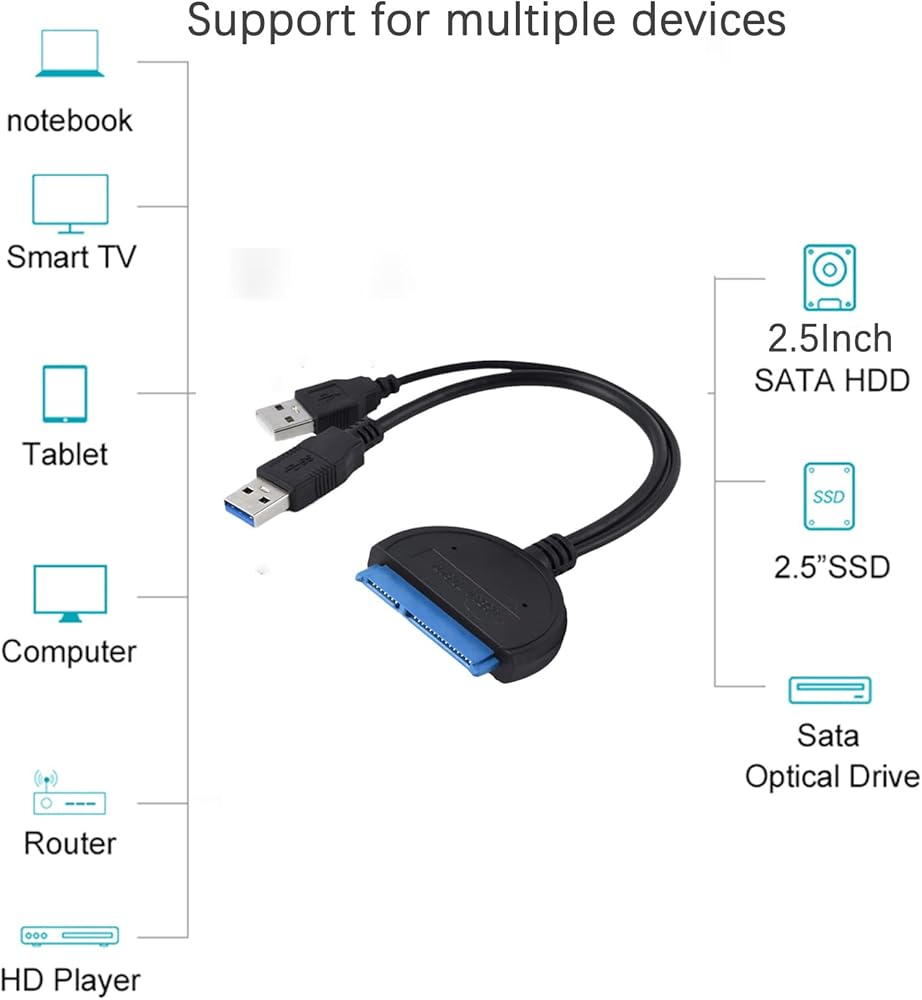 TUYXCIE USB to SATA Adapter, SATA to USB Cable for 2.5 Inch External Hard Disk Driver USB 3.0 SATA Adapter for SSD and HDD, Support UASP for PC Laptop (Double USB Blue)