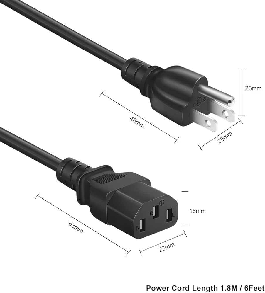 [Features Specs]: 3 Prong AC Power Cord, Extra-long 6 Feet Cable. UL SVT 3C*18AWG(0.824mm2) 105°C 300V VW-1 FT2. Connector plug: (IEC320) IEC-60320 C13 to NEMA 5-15P.