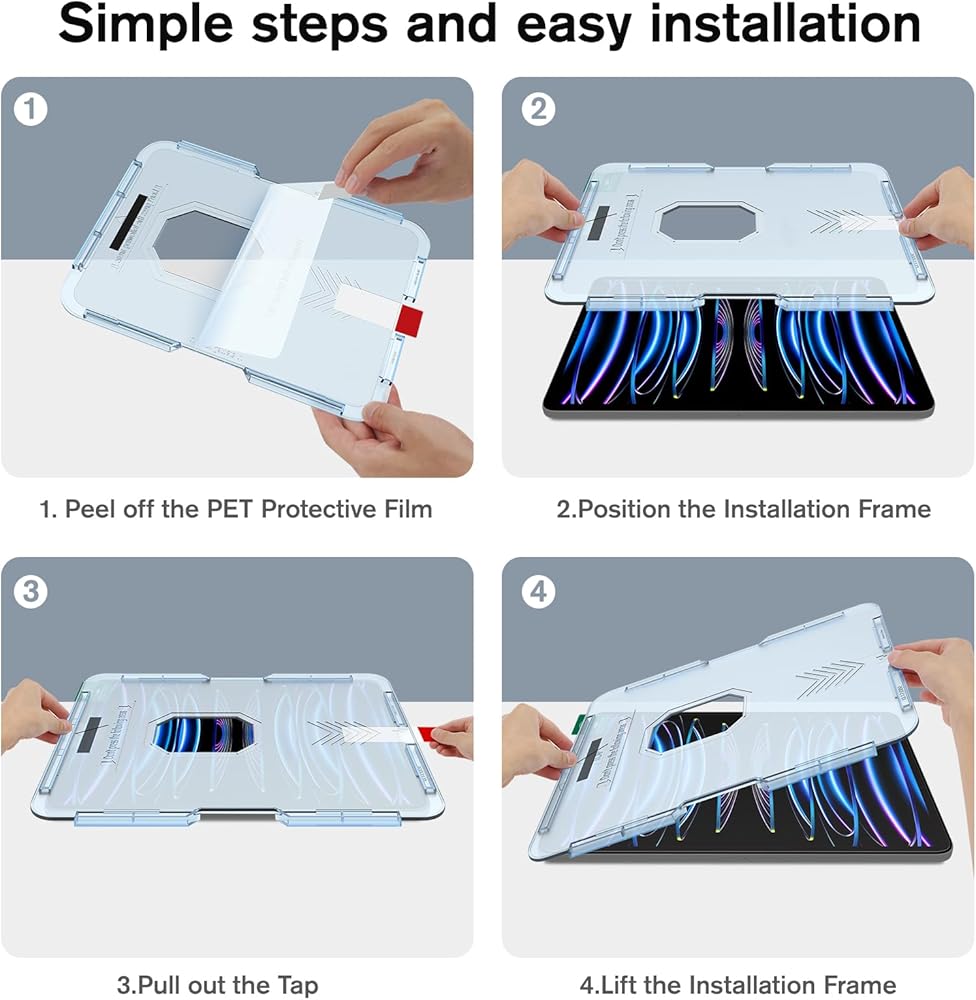 [INNOVATIVE INSTALLATION KITS] Installation is faster and easier thanks to the innovative installation kit provided. Just need to cover the alignment frame on the screen and the screen protector will automatically adsorb, effectively reducing air bubbles and perfectly fitting. In addition, a very detailed installation tutorial video is attached to the product manual, we recommend scanning the QR code to watch it before installation. Please feel free to contact us if you have any questions.