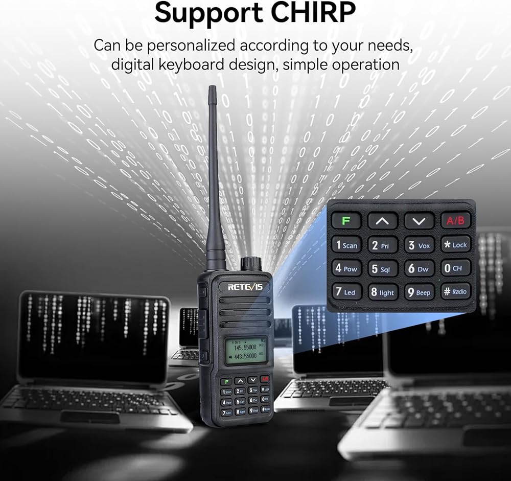 Support CHIRP; 200 channels; 50 CTCSS and 104 DCS can be adjusted or turned off via keyboard and screen; short press the "#" key to enter VFO mode and enter the same frequency to talk with other walkie talkies