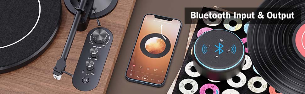 [Bluetooth Output&Input] With our Bluetooth Input and Output Turntable, it can not only connect your smartphone,tablets and other wireless audio, but can also connect your favorite wireless headphones, speakers