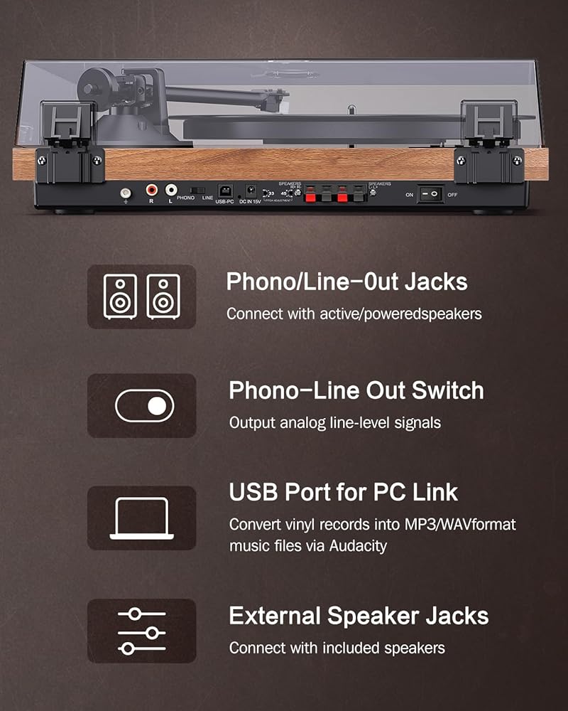 [Built-in Phono Preamp] Built-in switchable Phono-line and pre-amplifierllow to connect with the set of included speakers, or your stereo system via RCA jacks