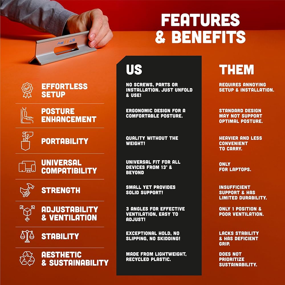Steepy Portable Laptop Stand for Desk – Adjustable Height, & Portable Laptop Holder – Ergonomic Computer Stand for Cooling & Comfort – Slip-Proof, Sturdy Design – Universal Fit for 13-17 Inch Devices