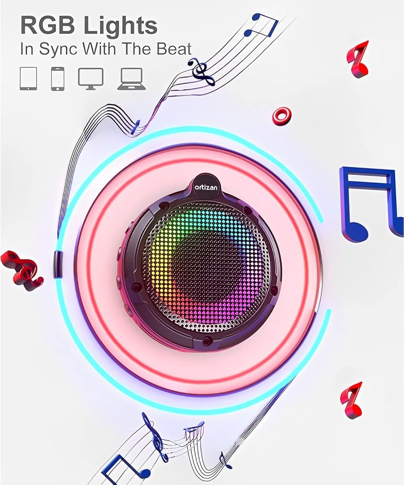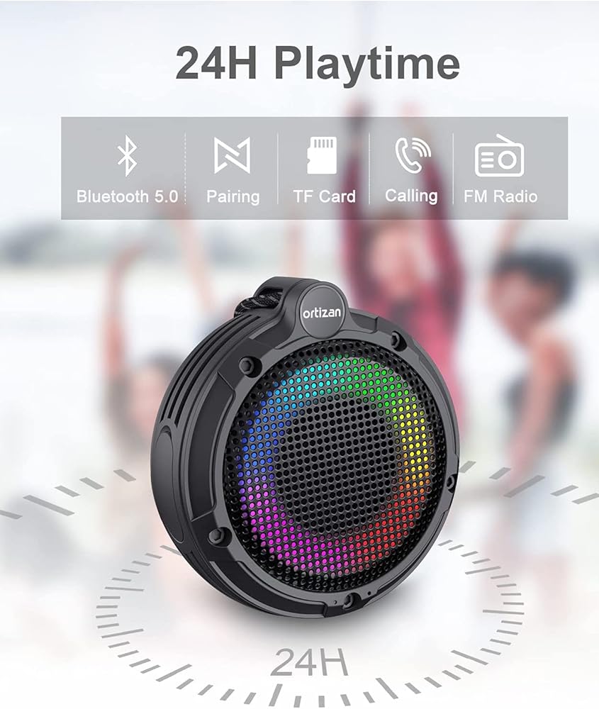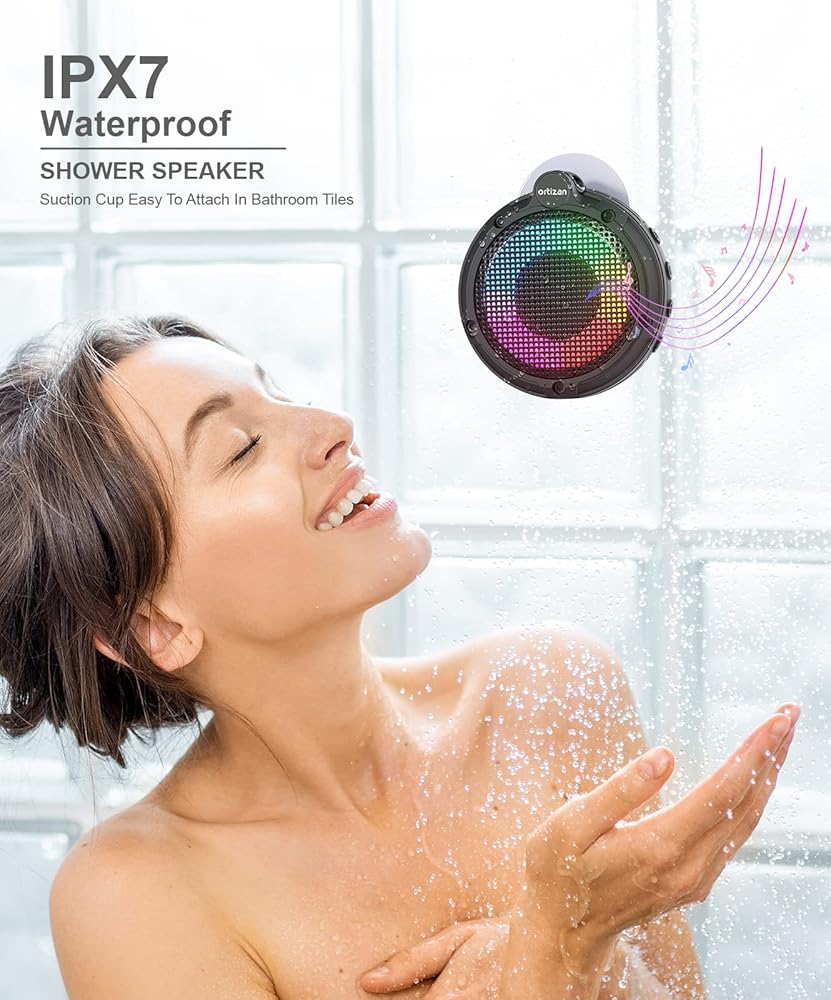 Ortizan Waterproof Shower Bluetooth Speaker, Portable Wireless Speaker with HD Sound, Stereo Pairing, LED Light, FM Radio, Floating, Outdoor Speaker for Kayaking, Beach, Hiking, Gifts for Men, Women