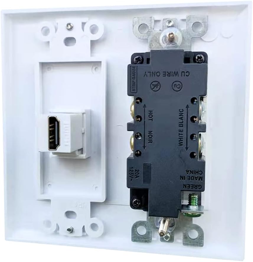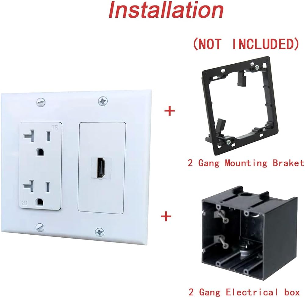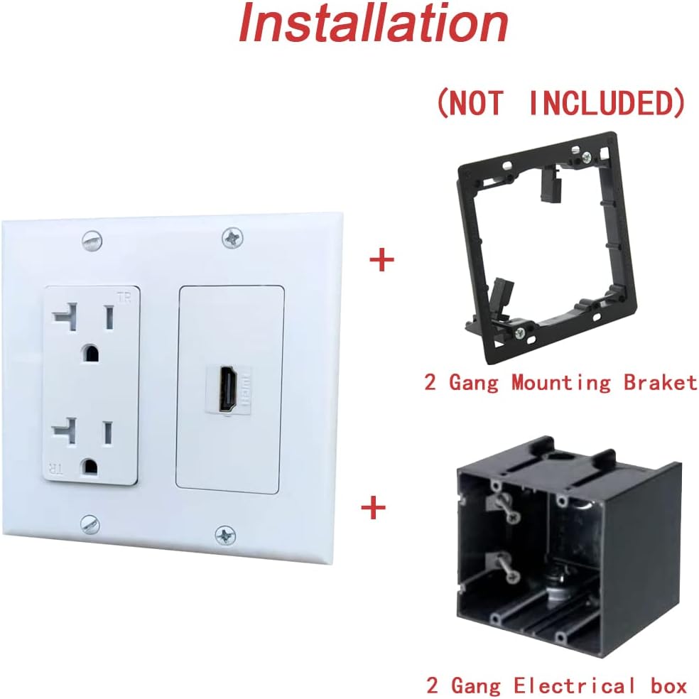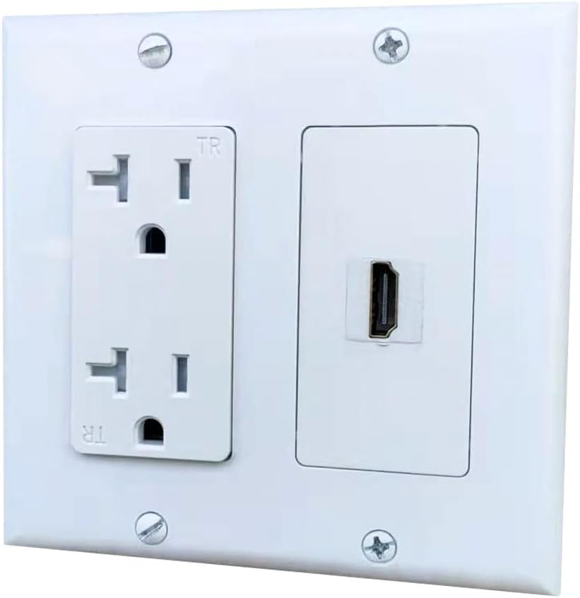 20Amp Power Outlet with 1 HDMI Port Wall Plate - 2 Gang Electrical Wall Outlet with HDTV Keystone Jack Cover Plate for TV Mount - White
