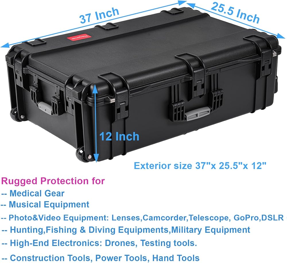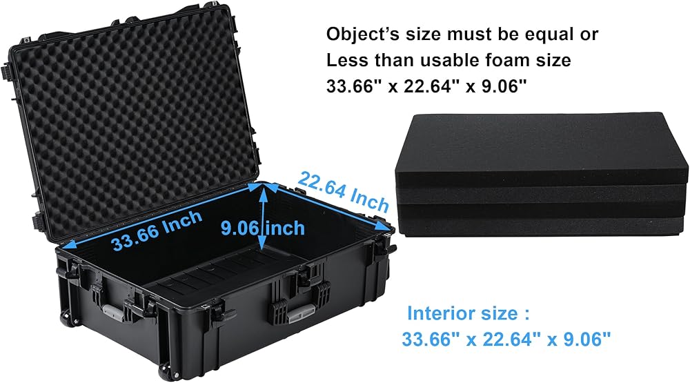 Rolling Case with Foam, 37 x 25.5 x 12 Inch, Transport Hard Case with Wheels/ 3 Large Handles for Camera, Tool, Equipment, Crushproof,Waterproof, Lockable, Inner 33.66" x 22.64" x 9.06"