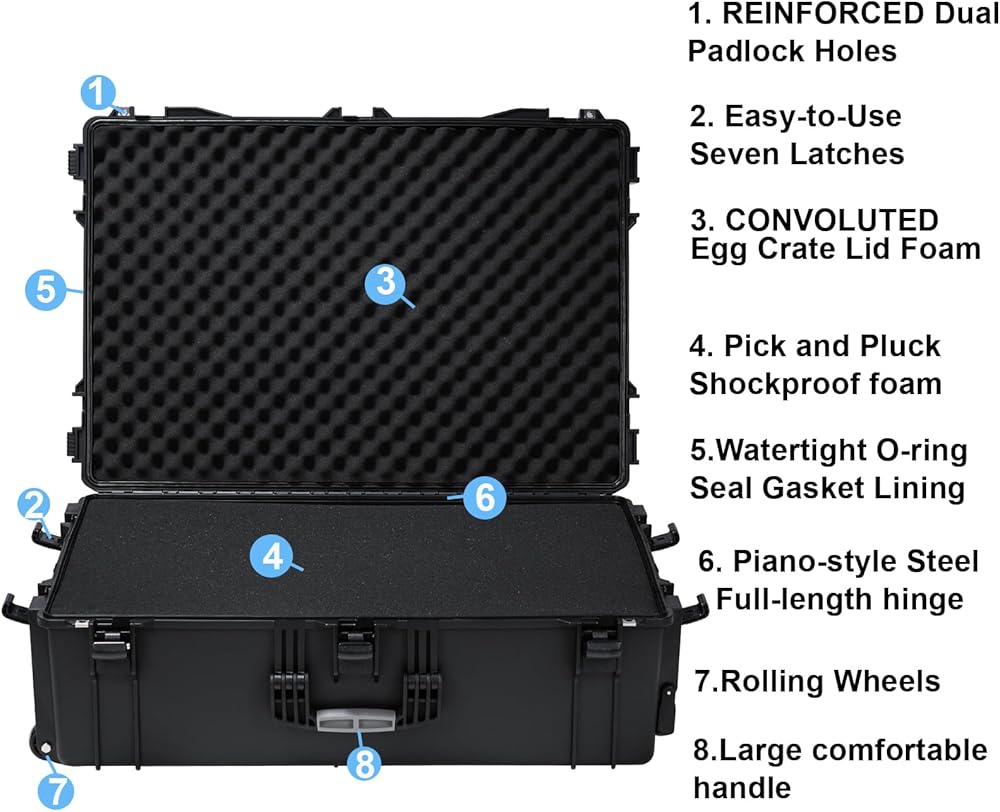 [Rugged & Durable] Crushproof high-impact polymer and heavy duty Handle for STRENGTH and DURABILITY, DOUBLE-LATCH system and Dual Padlock Holes for secure closure,travel-friendly when flying. Double-throw latches,Easy-to-Use. More competitive than others in the durability.