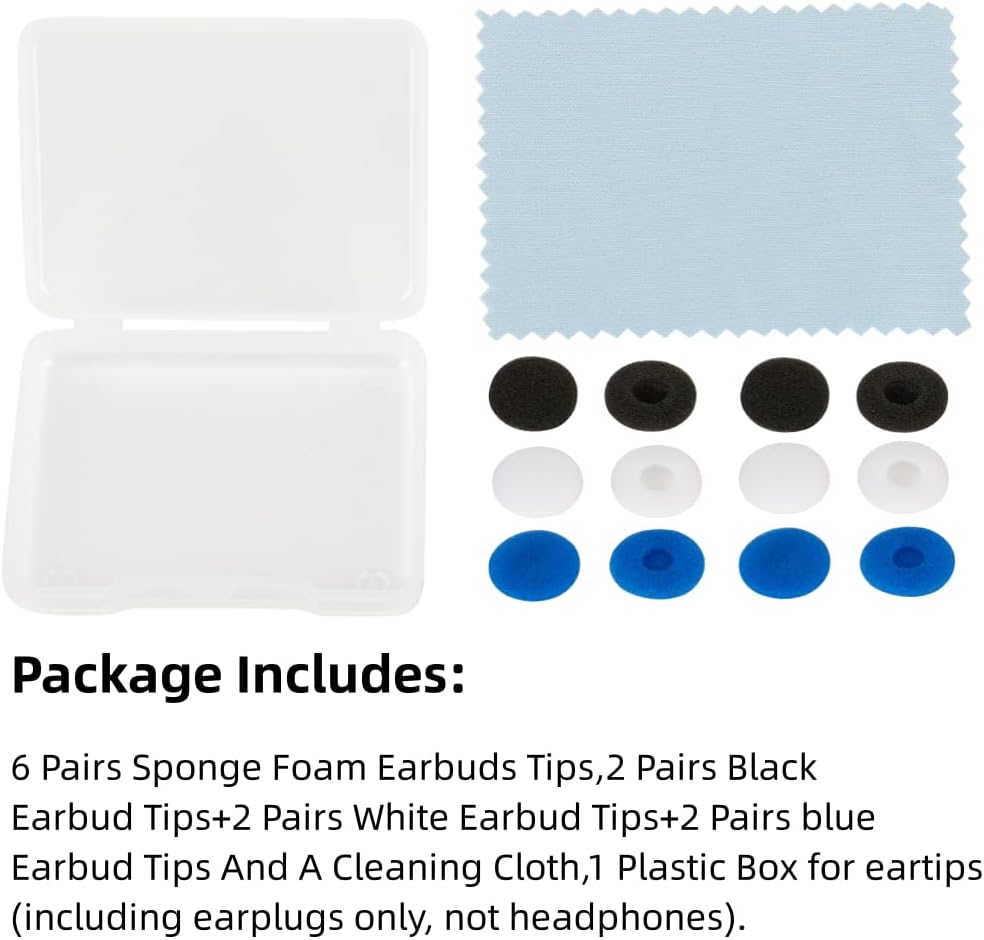 Package Includes:6 Pairs Sponge Foam Earbuds Tips, 3 Pairs red Earbud Tips+3 Pairs green Earbud TipsAnd A Cleaning Cloth,1 Plastic Box for eartips(Excluding Headphones).