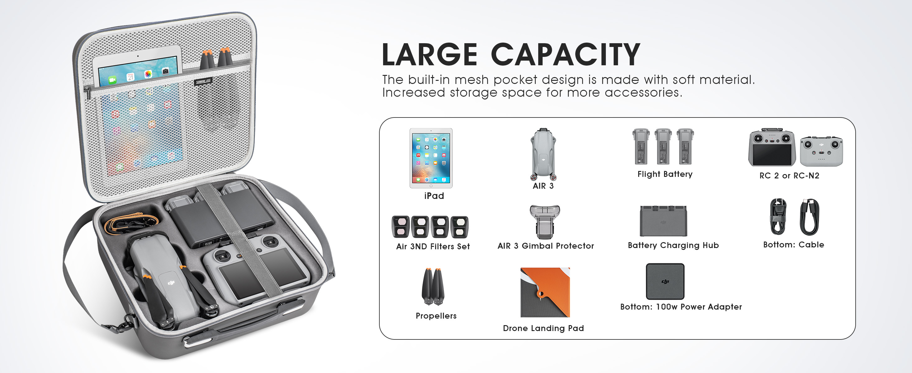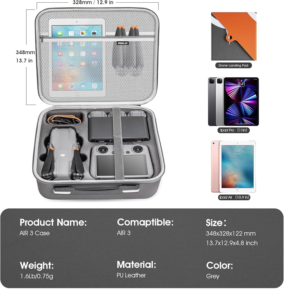 LARGE CAPACITY:DJI Air 3 case has a large enough capacity that it can hold the DJI Air 3 drone, RC 2/RC-N2 controller, battery charging hub, power adapter, and other important accessories, ensuring that you have everything you need right at your fingertips.