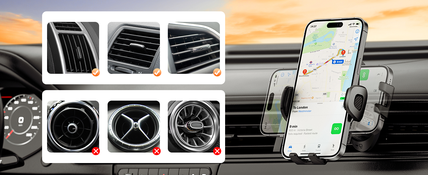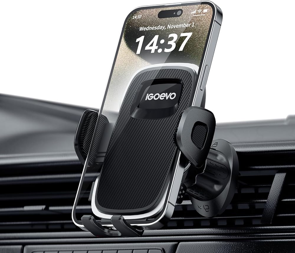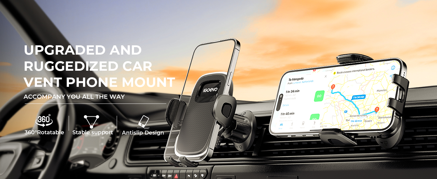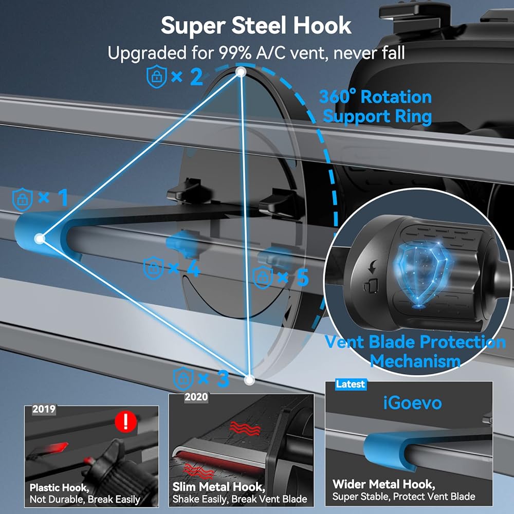 👍[2023 Upgraded Ultra Stable]👍 iGoevo phone holder for car vent adopts the latest 2023 Military-Grade metal clip mechanical screw lock design wider, longer adjustable hook, more stable, truly durable. which holds your phone securely to the vent, even on the bumpiest road or sharper turn. Never drop, and never damage your air vent slat.