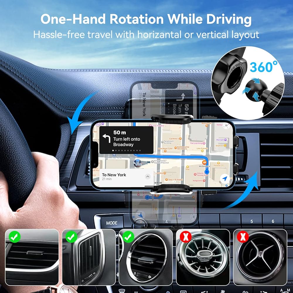👍[Expert Car Vent Phone Holder]👍This car vent phone mount has a highly flexible 360-degree swivel head that provides quick switching between vertical and landscape views. Position your phone at the optimal viewing angle, and spend more time at the wheel and eyes on the road.