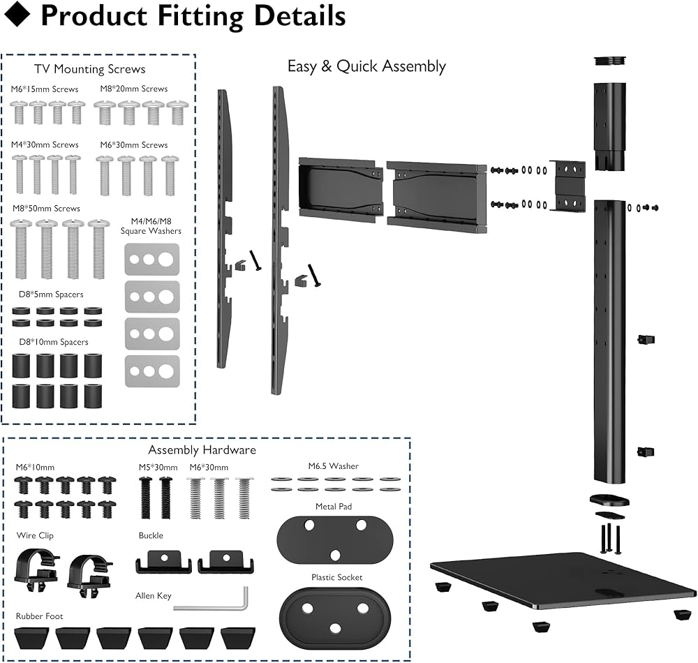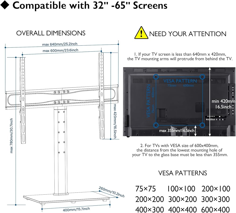 COMPATIBILITY - Universal tv table top stand fits most 32-65‘' TVs; VESA patterns: 100x100/200x100/200x200/300x200/300x300/400x200/400x300/400x400/600x400mm, it is compatible with TV brands such as Insignia,TCL,SAMSUNG,Toshiba,LG,Hisense,VIZIO,Pioneer,Sceptre,Philips,Sony,Panasonic,Sharp,Element and more LCD OLED LED 4K TVs.