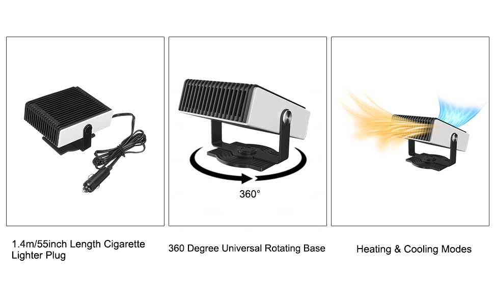【Heater and Cooler Fan】With 3 adjustment switches (Fan/Off/Heat) for easy operation. This car heater is not only for defrosting/defogging windows and windshields, but also can be used as a cooling fan in summer.