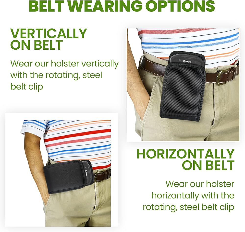 Ergonomically Designed Handheld Scanner Holster - Wear it on your belt either horizontally or vertically, or clip it to your pocket. Designed for heavy-use industrial environments and offers military-grade, rugged durability and protection for your device. Adjust the angle to meet your needs.