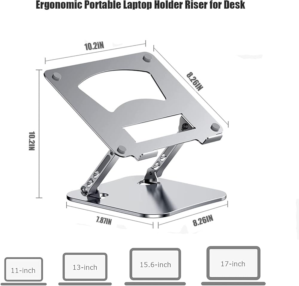 【Durable and Ventilation Hollow Design】: With the specially processed aluminum alloy material, Notebook stand can be delicate feel, easy to clean, rust-proof; scratch-proof; Metal heat conduction alloy and ventilation hollow design, to help computer on cooling, prevent overheating.This laptop stand fits all tablets and laptops models and sizes from 10-17 inches. .