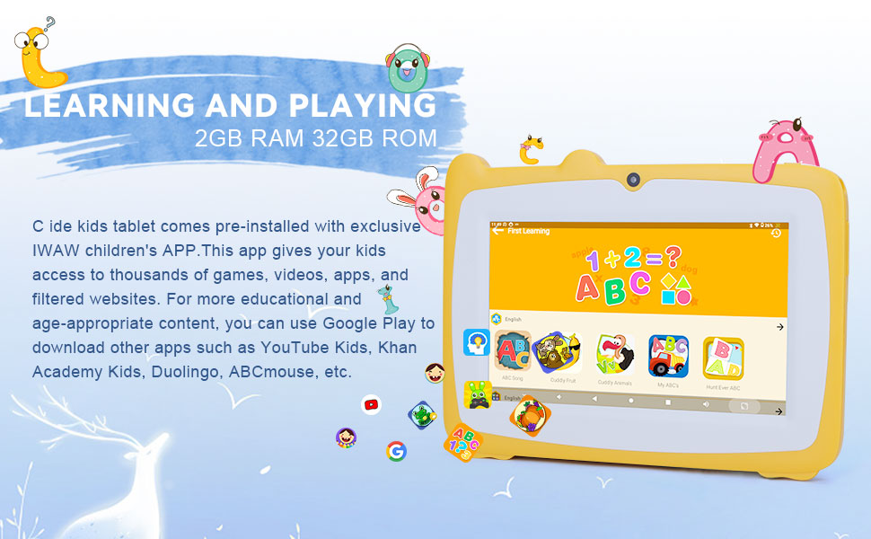 【التعلم من خلال المتعة】تم تصميم هذا الجهاز اللوحي خصيصًا للأطفال من سن 3 إلى 7 سنوات، لبناء مهاراتهم وتطوير خيالهم. يسمح Iwawa وGoogle Store المثبتان مسبقًا للأطفال بالعثور على تطبيقات وألعاب التعلم المفضلة لديهم. توفر لك أجهزة الكمبيوتر اللوحية C Idea للأطفال جهازًا لوحيًا تعليميًا قويًا الكل في واحد للأطفال. التعلم والنمو في لعبة سعيدة.