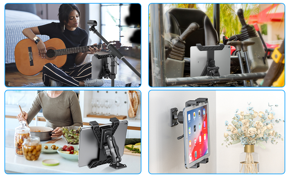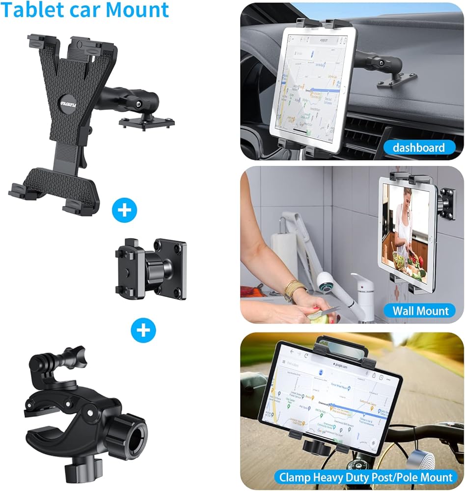 👍【Multi-function Heavy Duty Tablet Holder】👍: This tablet car mount There are three ways to install and use, with the use of different accessories to show different functions, can be installed on the wall, car,Your tablet while using exercise equipment such as Peloton bikes, Ellipticals, Treadmills, Spin bikes, and any other indoor exercise equipment. The clamp makes it easy to install and remove the mount by using the adjustable knob.