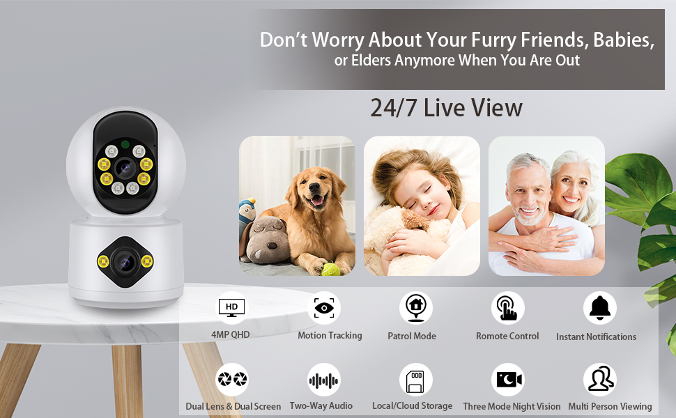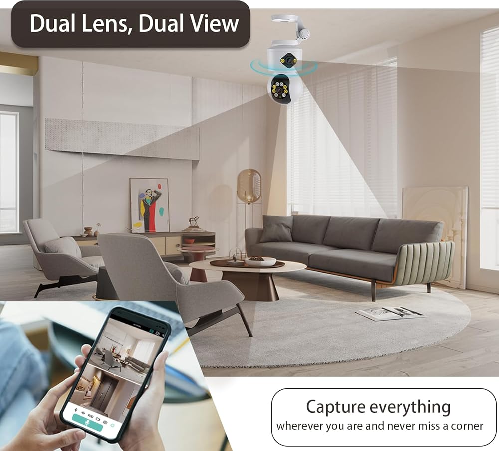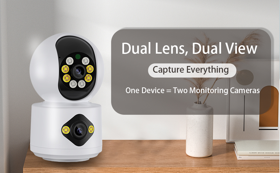 【4MP Supper HD & Dual Lens】 Dual Lens indoor cameras restores 4MP Ultra-clear Wifi cameras quality to ensure you have a whole view of your home from anywhere at all times. allows you to keep an eye on crucial spots with a fixed zoom lens while remotely adjusting the other lens through your mobile phone. Perfectly for for monitoring home, Pets, Babies and the elderly safe.