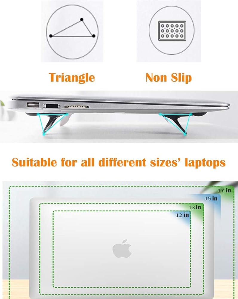 【Sturdy & Easy to Use】This portable laptop stand is made of premium ABS and metal material, it's as light as paper and slim as a coin but can hold up to 17” laptops including MacBook Air and Pro. The stand feet can resist pressure without bending or flexing when you type or play games, and it's also easy to open and close. Notice: Not suitable for Microsoft Surface series, MX Keys keyboard and Asus Zenbook 14.