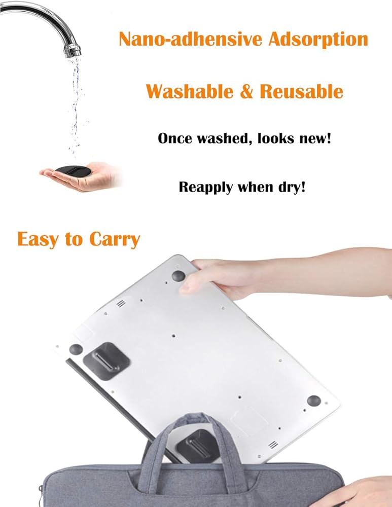 【Washable & Reusable】With special removable Nano-adhesive, this laptop desk holder is washable. Once washed, it looks like new and can be reused when dry! The most important thing is our invisible stand won't leave any marks or scratches on laptops when you remove it!