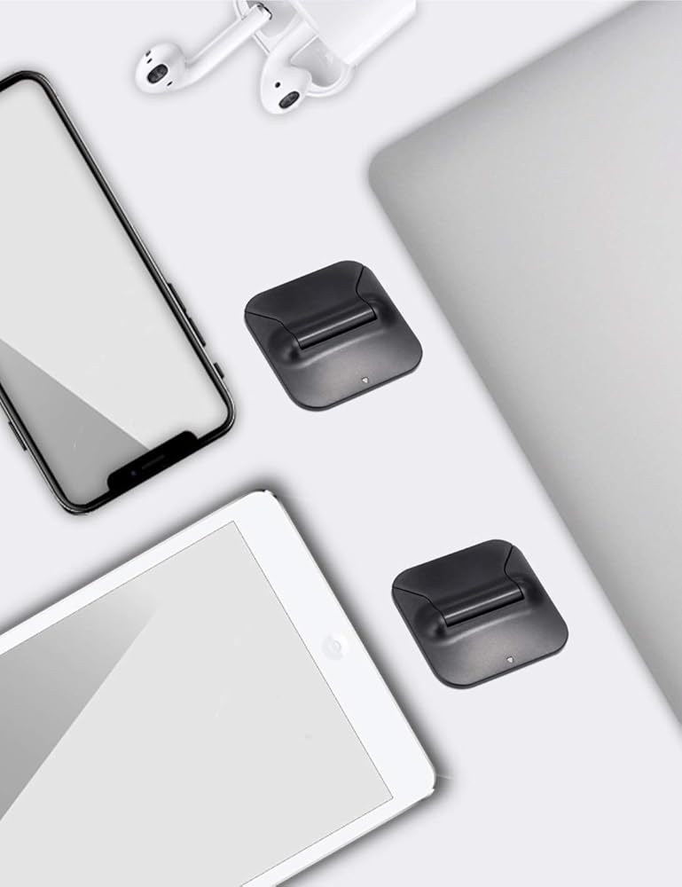 Karack Laptop Stand is also Computer Keyboard Stand and Cellphone Stand! Features: Portable Laptop Stand Light as a pen and Slim as a coin its Perfect for carrying and business travel Ergonomic Design angeling the laptop 10°, this ergonomic stand can effectively relieve your neck, shoulder and wrist pain of continuous typing. Cool Your Laptop Better You can freely stick this mini stand according to laptop's air vent. It keeps your laptop cooler and prevents it from overheating. Wide Compatibility Made of premium ABS and metal material, this foldable stand can hold up to 17” laptops, despite it's as light as paper and slim as a coin design. Washable & Reusable With special removable Nano-adhesive, this laptop desk holder is washable. Once washed, it looks like new and can be reused when dry! The most important thing is our invisible stand won't leave any marks or scratches on laptops when you remove it! Almost invisable design Functions as a seamless attachment of your computer Materials: Premium ABS Metal shaft Nano-adhesive Dimension: 1.97*1.97*0.26 inch What included: 2 x Foldable Laptop stand