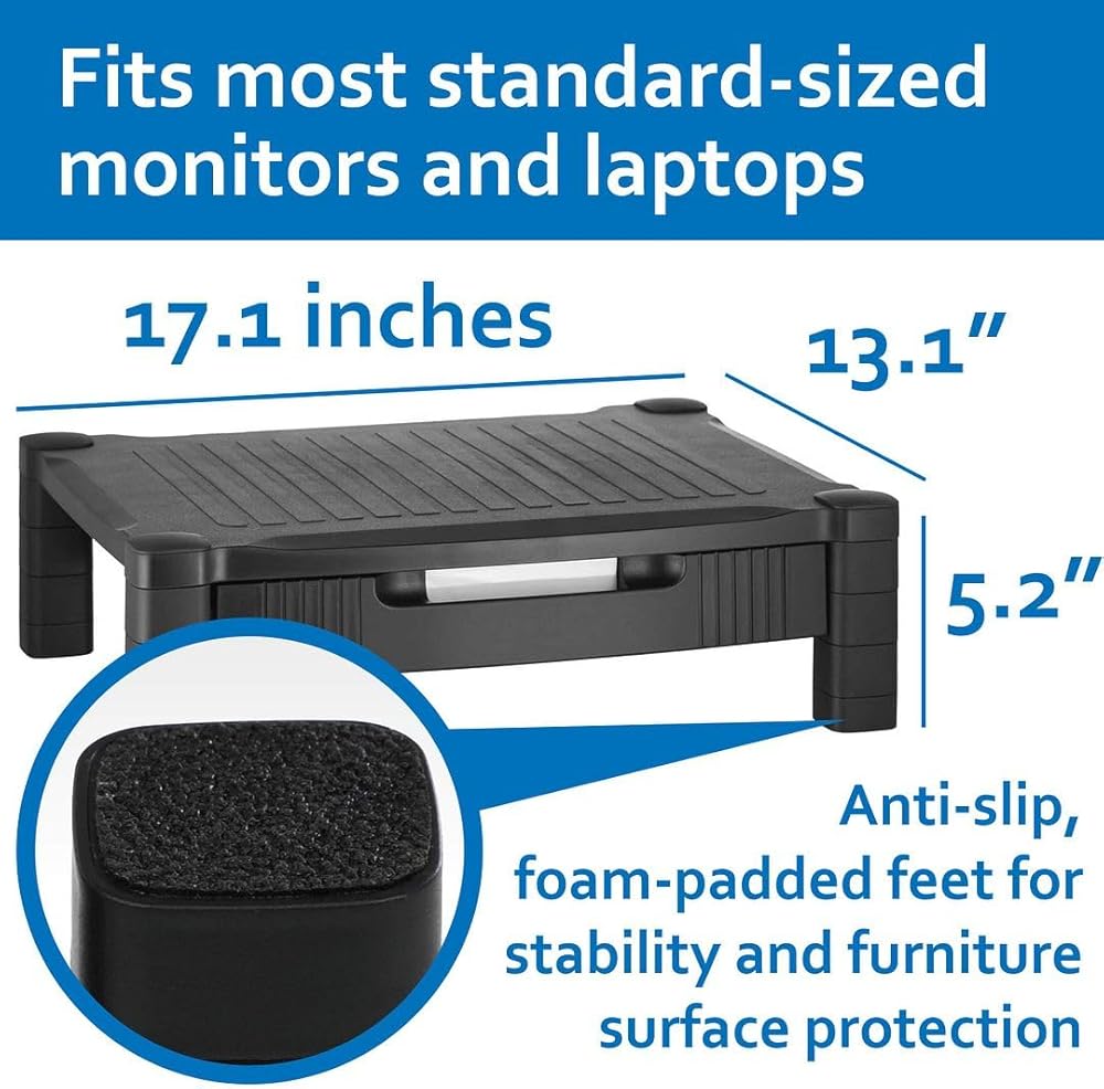 Stable, durable, and easy to assemble; Made with high quality PVC plastic; Can hold as much as up to 20 lbs; Features a non-skid rubber feet and a universal size platform that fits most flat panel monitors to provide stability whenever you're working