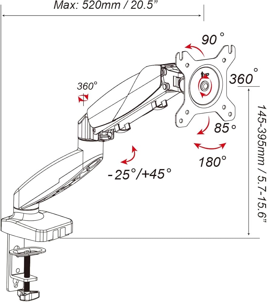 تعديل ارتفاع زنبرك الغاز: تعديل ارتفاع سلس وسهل بين 140 ملم إلى 390 ملم، تعديل الميل: يمكن إمالة لوحة الشاشة حتى +90 درجة أو إلى -85 درجة.