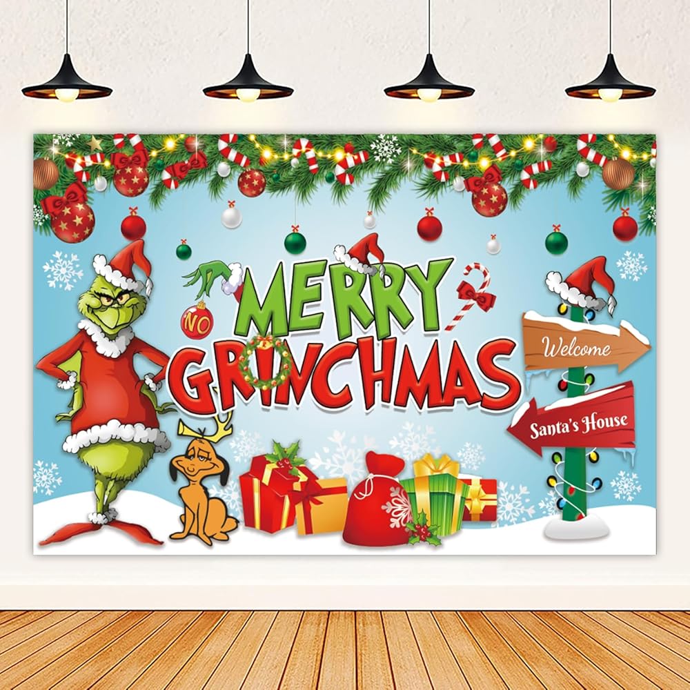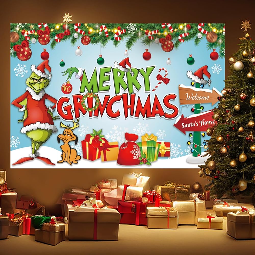 【Grinchmas Christmas Decorations】:You wil get a merry grinchmas backdrop which is 59''x39.4'' (150*100cm).Printed with merry grinchmas words, the pattern is clear and colorful, giving your Christmas party a bright visual effect!