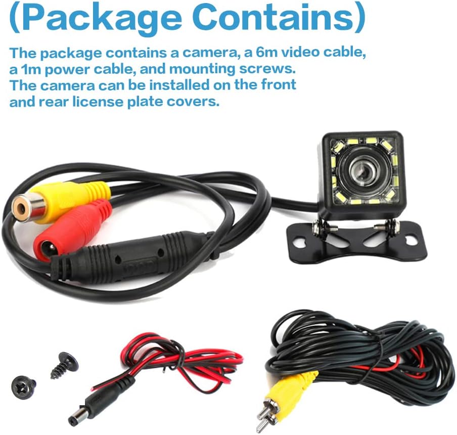 [Package Contains] The package contains a camera, a 6m video cable, a 1m power cable, and mounting screws. The camera can be installed on the front and rear license plate covers.