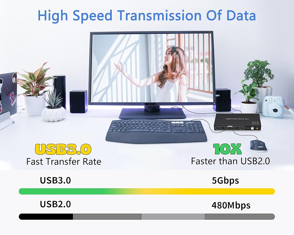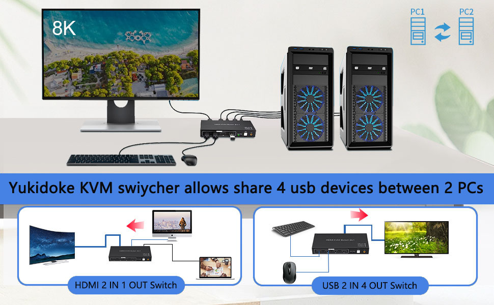 Yukidoke HDMI USB KVM Switch SW206N: The KVM Switcher SW206N has 2 input ports, HDMI and USB. You can control 2 devices (like PC, camera, PS4) at the same time. The output port has one HDMI ports and four USB ports. HDMI output ports connect to the TV, monitor, projector, the USB ports connect keyboard, mouse, USB, HDD, etc. It's Convenient to share multiple HDMI USB devices on 2 PCs.