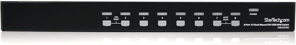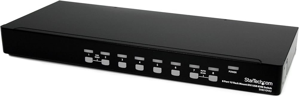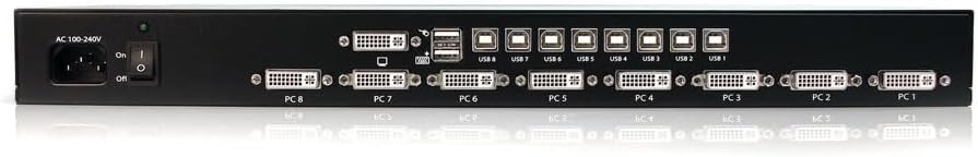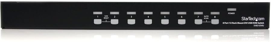 Supports DVI/HDMI resolutions up to 1920x1200 Can be used with DVI to HDMI adapters to connect HDMI based systems Support for most combo/wireless keyboard and mice OS independent – No software or drivers required Front panel push-buttons and Hot-key functions allow for easy switching Auto-scan function cycles through computers sequentially Connects to USB-based computer systems USB console interfaces for keyboard and mouse Supports Mac® and Sun keyboard mapping - Keyboard states automatically saved and restored when switching computers Supports Microsoft IntelliMouse (Pro) The SV831DVIU 8-Port 1U Rack Mount DVI USB KVM Switch lets you control up to 8 USB-connected computers (each with DVI or HDMI display output) from a single keyboard, mouse and monitor. The KVM switch offers maximum control, allowing you to switch computers using hot-key commands or front panel push-buttons. Supporting digital resolutions up to 1920x1200 via DVI or HDMI connection (using DVI to HDMI adapter - see accessories), the KVM provides the high resolutions recommended for newer displays, allowing you to take full advantage of your monitor/screen capability. A perfect addition to any server room or software test lab, this 8-port switch can be rack-mounted into 1U of cabinet space. This product is TAA compliant and backed by a Startech.com 3-year warranty with free lifetime technical support. Note: This KVM supports digital signals only, and cannot be used with DVI-to-VGA adapters. Ideal for software development and QA test labs with multiple PCs and platforms connected to one console Single console administration of your co-location/ISP facility Create a streamlined access solution in your Datacenter or Server Farm Great for PC test/burn-in computer control saving the desk space required for multiple monitors, keyboards and mice Perfect for manufacturing line computer control, simplifying access to multiple systems High-resolution 1920x1200 DVI connections support control of DVI systems or HDMI systems (with adapter) Supports wireless and combo style mouse and keyboard sets for added flexibility Specifications Warranty Information Warranty 3 Years Connector(s) 1 - Console Interface(s) DVI-I (29 pin) 2 - Console Interface(s) USB Type-A (4 pin) USB 2.0 8 - Host Connectors USB B (4 pin) DVI-I (29 pin) Environmental Operating Temperature 0°C to 40°C (32°F to 104°F) Storage Temperature -20°C to 60°C (-4°F to 140°F) Humidity 0~80%RH Hardware Audio No KVM Ports 8 PC Interface USB PC Video Type DVI Number of Monitors Supported 1 Rack-Mountable Yes Cables Included No U Height 1U Daisy-Chain No Packaging Information Package Height 3,5 in [90 mm] Package Length 23,4 in [59,5 cm] Shipping (Package) Weight 8,3 lb [3,8 kg] Package Width 10,4 in [26,5 cm] Performance On-Screen Display No DVI Support Yes - Single Link IP Control No Hot-Key Selection Yes Maximum Cable Length 15,0 ft [4,6 m] Maximum Digital Resolutions 1920 x 1200 Maximum Number of Users 1 Port Selection Support Push Button and Hotkeys MTBF 134000 hours Physical Characteristics Weight of Product 5,5 lb [2,5 kg] Color Black Material Steel Product Length 7,1 in [18 cm] Product Width 17,2 in [43,8 cm] Product Height 1,7 in [4,4 cm] Power Power Source AC Adapter Included Input Voltage 100 - 240 AC Input Current 1.8A Output Voltage 12V DC Output Current 4A Center Tip Polarity Positive Plug Type M Power Consumption (In Watts) 48 Software OS Compatibility OS independent; No software or drivers required Special Notes / Requirements Note Supports SUN keyboard emulation What's in the Box 1 - Included in Package 8 Port DVI USB KVM Switch Set Rack-mount brackets User Manual 3 - Included in Package Universal power adapter: comes ready for NA/EU/UK only when you buy in NA/EU/UK; comes ready for Australia and New Zealand only when you buy in Australia and New Zealand