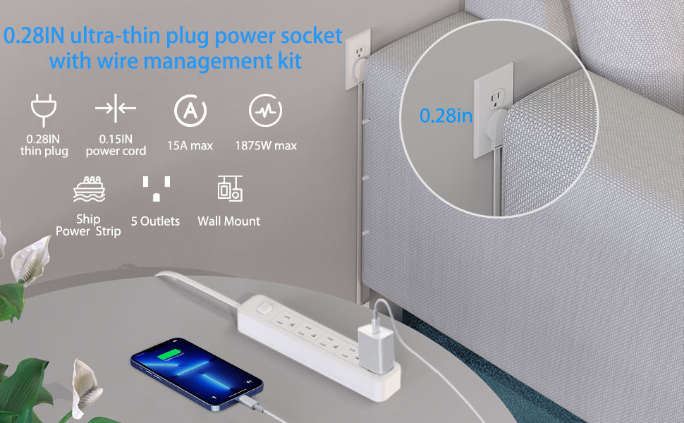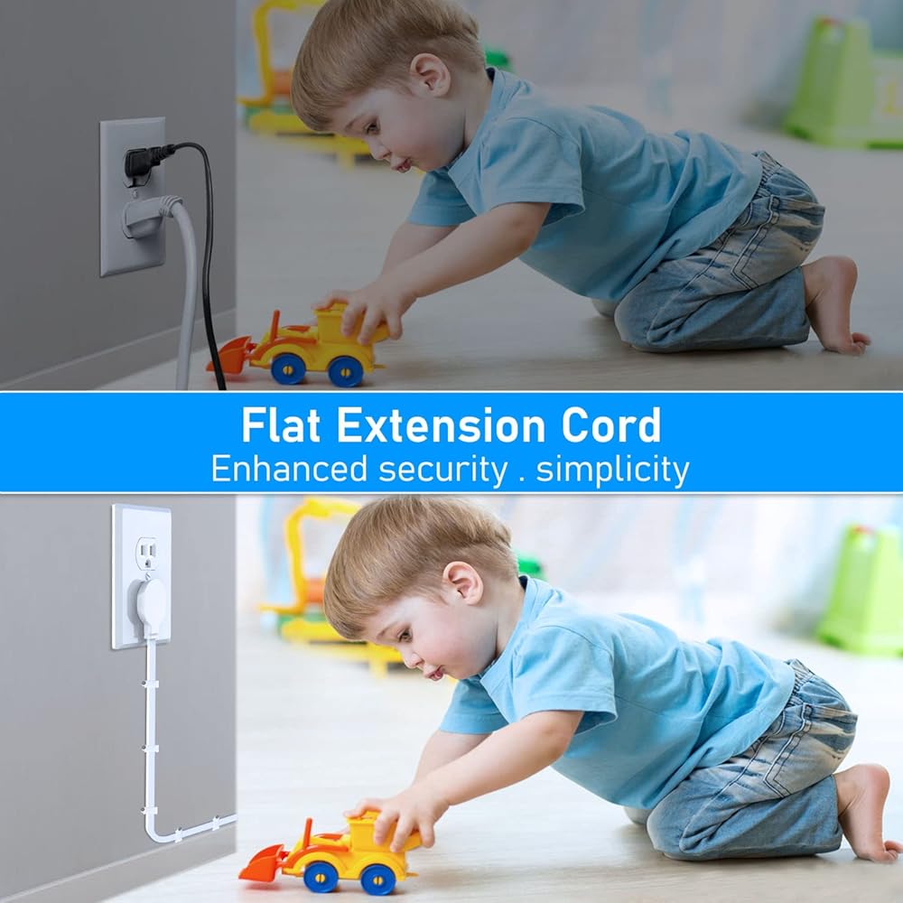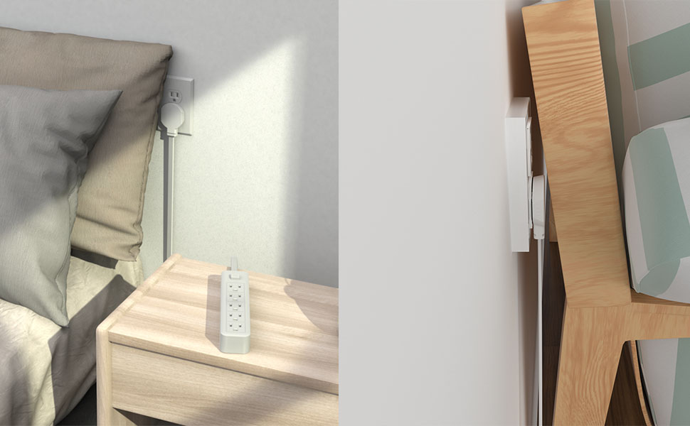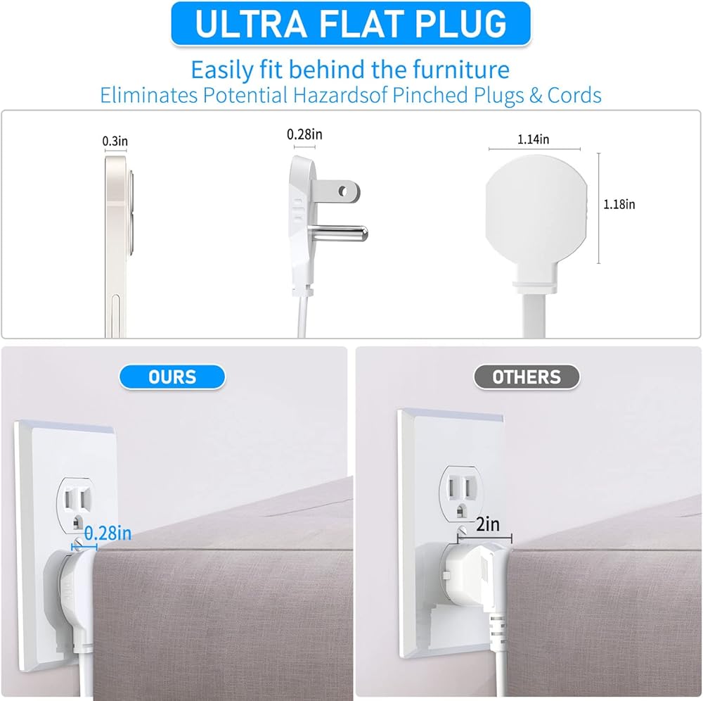 【Upgraded ultra-flat plug and flexible flat extension cord】 Only 0.35 inches ultra-thin design, slimmer than traditional plugs, can be easily placed close to the wall, hidden behind furniture, sofas and beds.The flexible, soft flat extension cord allows you to run the cord under rugs. Comes with a bag of wall nails that you can install on the wall to make your room more tidy.