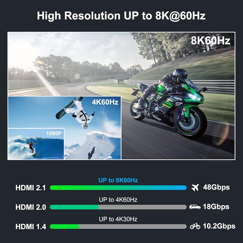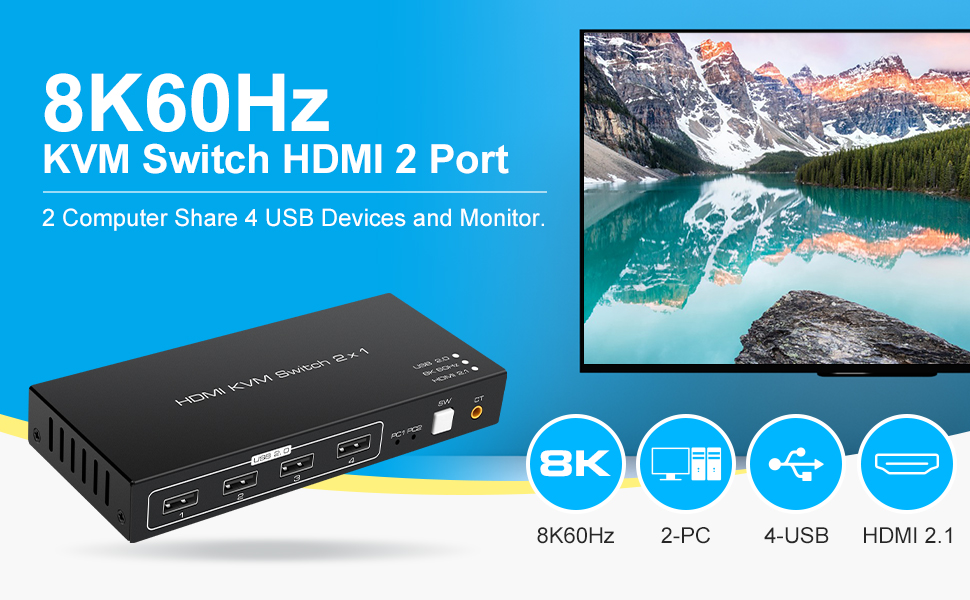 【HDMI KVM Switch Support 8K@60Hz 】 The USB 2.0 KVM Switch support resolution 8K@60Hz and built-in automatic adjustment system,makes image display more exquisite and realistic,The colors are brighter and more moving, bringing you an irresistible visual feast.Also support 1080P@120Hz.